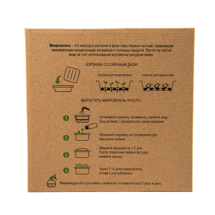 Проращиватель «Моя микрозелень» подходит для выращивания сочной микрозелени и проростков.Микрозелень – молодые всходы растений в фазе первых двух листочков, содержащие максимальную концентрацию витаминов и полезных веществ. Растет на чистой воде за счет использования внутренних ресурсов семян. Комплектация набора: - крышка, - корзинка, - сменное дно, - емкость для жидкости. Проращиватель подходит как для крупных семян, так и для самых мелких. Для выращивания микрозелени установите сменное дно широкими бороздами вверх. Для проростков - широкими бороздами вниз. -