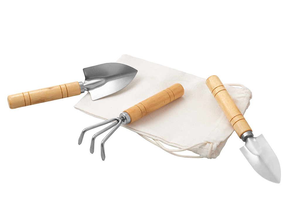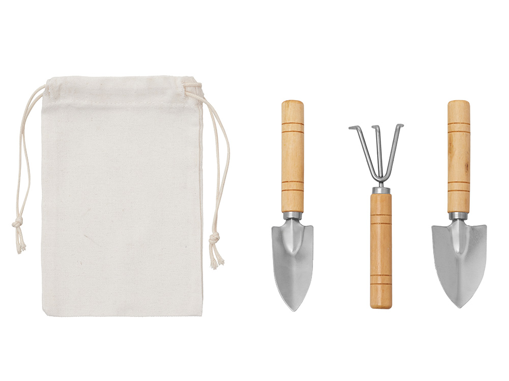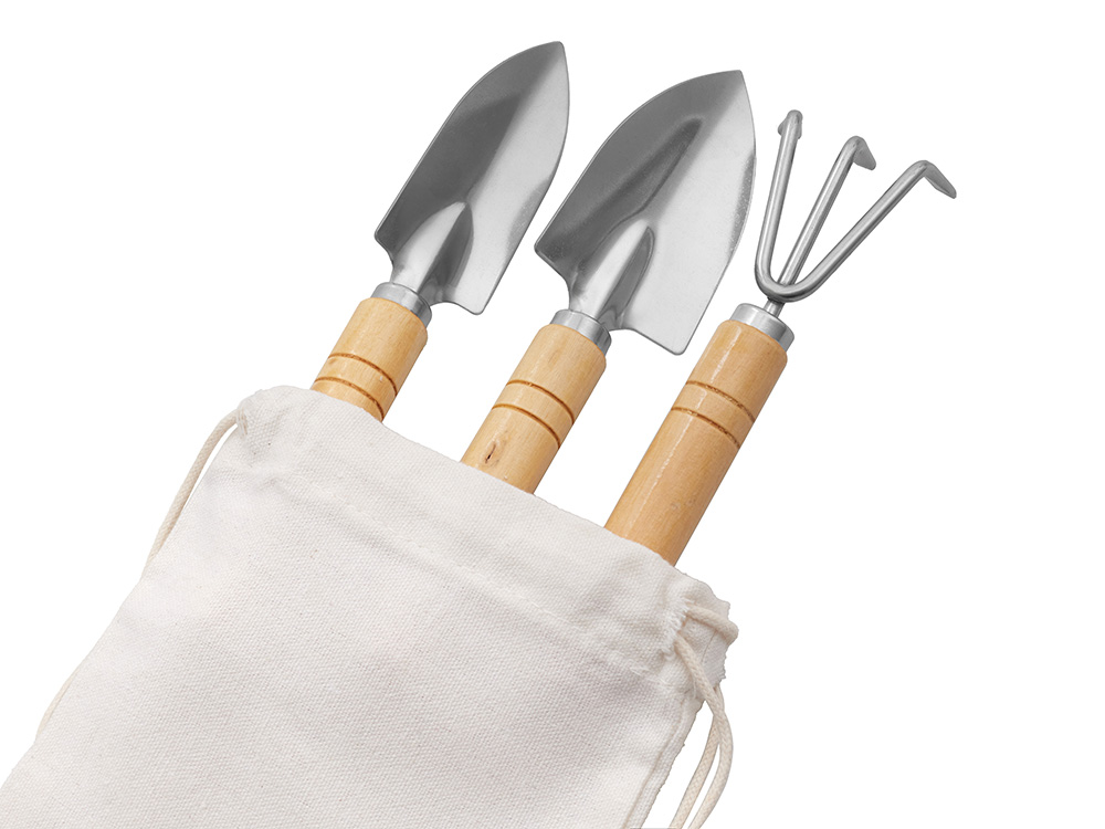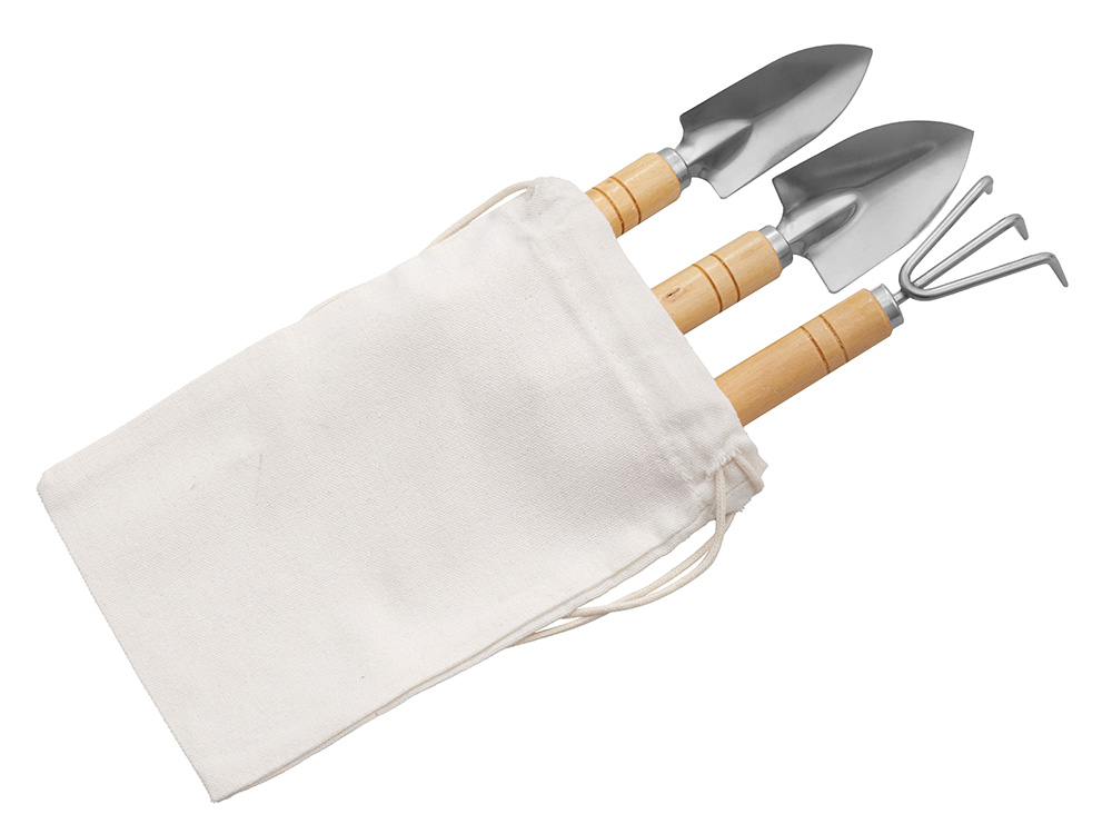 Садовый набор из 3 аксессуаров из нержавеющей стали с бамбуковыми ручками. Включает большую и малую лопатки и грабли. В комплект входит хлопковый мешочек. -