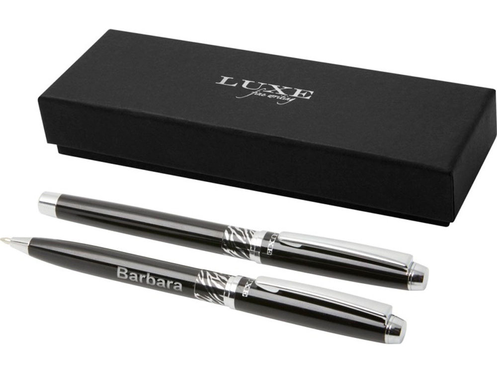 Шариковая ручка и ручка-роллер с декоративным узором на корпусе. Шариковая ручка предварительно заполнена синими чернилами, а ручка-роллер предварительно заполнена черными чернилами. Упакована в подарочную коробку LUXE. Латунь. -
