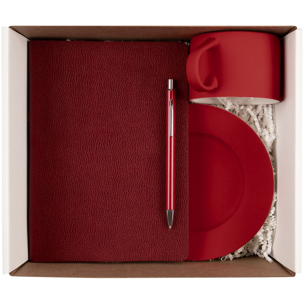 ежедневник - искусственная кожа; чайная пара - фарфор, покрытие соф-тач; ручка - металл; коробка - микрогофрокартон