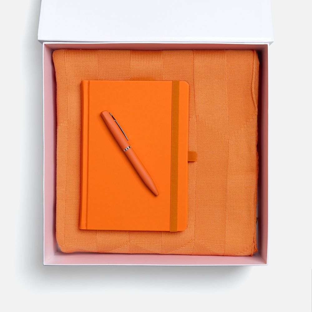 Однотонный набор с основной канцелярией и пледом — классика жанра в уютном исполнении. С компактным ежедневником будет удобно делать заметки в любое время — благодаря петельке для ручки любимый пишущий инструмент будет всегда под рукой. А изысканный акриловый плед с геометрическим узором позволит выразить самые теплые пожелания и ддобавит плавных линий в интерьер. -