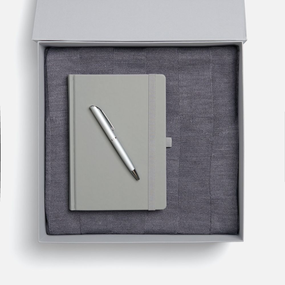 Однотонный набор с основной канцелярией и пледом — классика жанра в уютном исполнении. С компактным ежедневником будет удобно делать заметки в любое время — благодаря петельке для ручки любимый пишущий инструмент будет всегда под рукой. А изысканный акриловый плед с геометрическим узором позволит выразить самые теплые пожелания и ддобавит плавных линий в интерьер. -