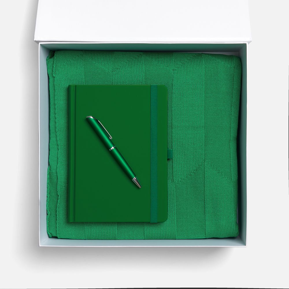 Однотонный набор с основной канцелярией и пледом — классика жанра в уютном исполнении. С компактным ежедневником будет удобно делать заметки в любое время — благодаря петельке для ручки любимый пишущий инструмент будет всегда под рукой. А изысканный акриловый плед с геометрическим узором позволит выразить самые теплые пожелания и ддобавит плавных линий в интерьер. -