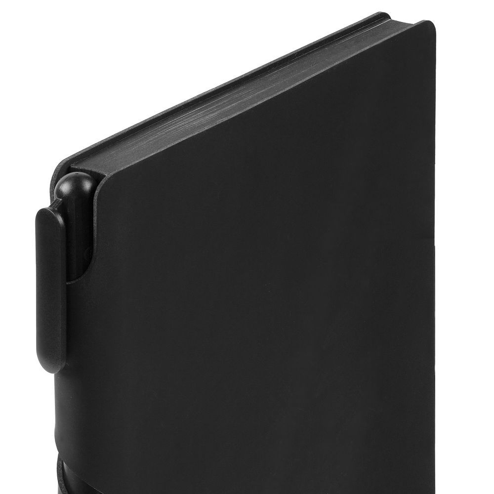 Удобный ежедневник с гибкой обложкой и местом под ручку в корешке, миниатюрная ручка из переработанного пластика и компактная самосборная коробка — простые составляющие полезного делового набора. -