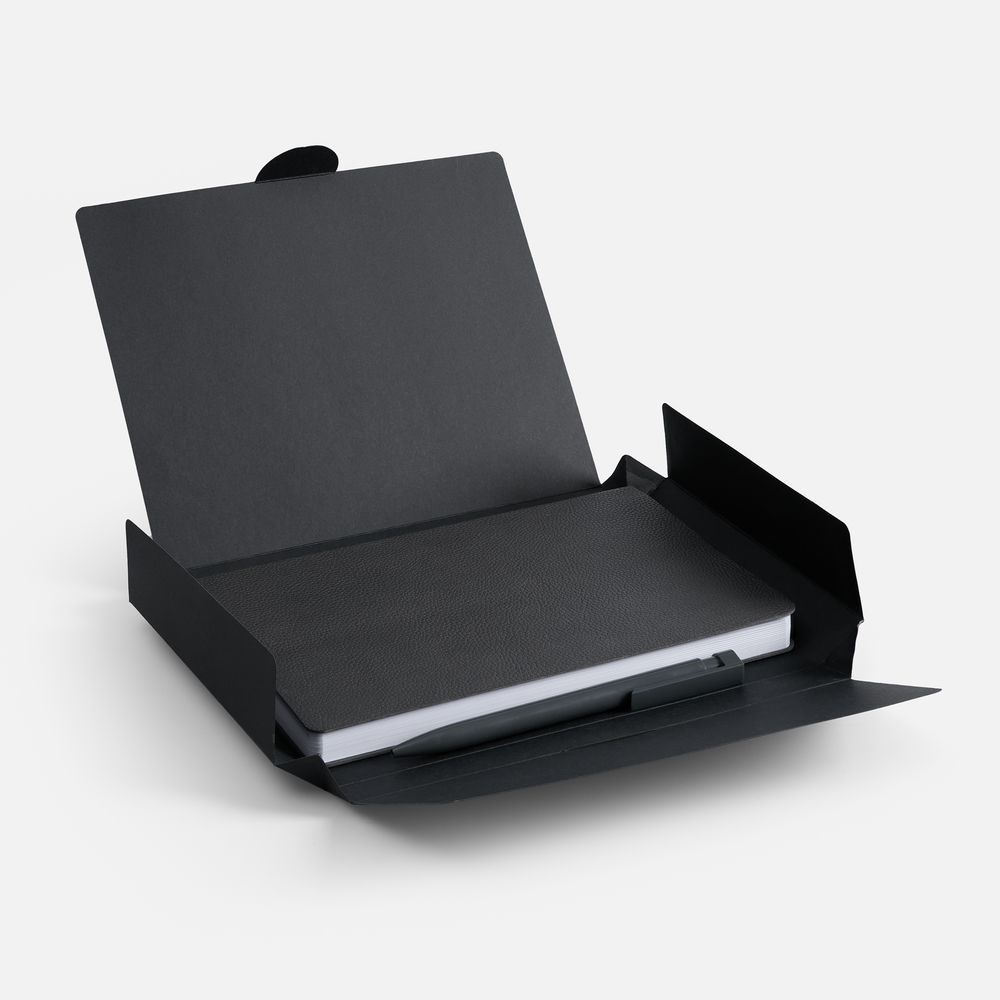 Недатированный ежедневник с гибкой обложкой из фактурного материала La Fite и металлическим шильдом на ляссе и ручка в тон, упакованные в подарочную коробку из дизайнерского картона. -