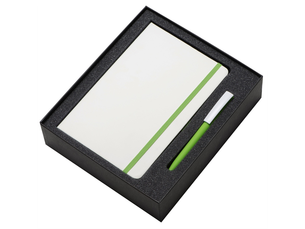 блокнот - искусственная кожа, бумага, ручка - пластик с покрытием soft-touch, коробка - кашированный картон