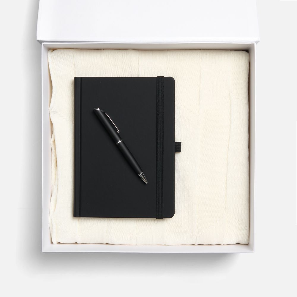 Однотонный набор с основной канцелярией и пледом — классика жанра в уютном исполнении. С компактным ежедневником будет удобно делать заметки в любое время — благодаря петельке для ручки любимый пишущий инструмент будет всегда под рукой. А изысканный акриловый плед с геометрическим узором позволит выразить самые теплые пожелания и ддобавит плавных линий в интерьер. -