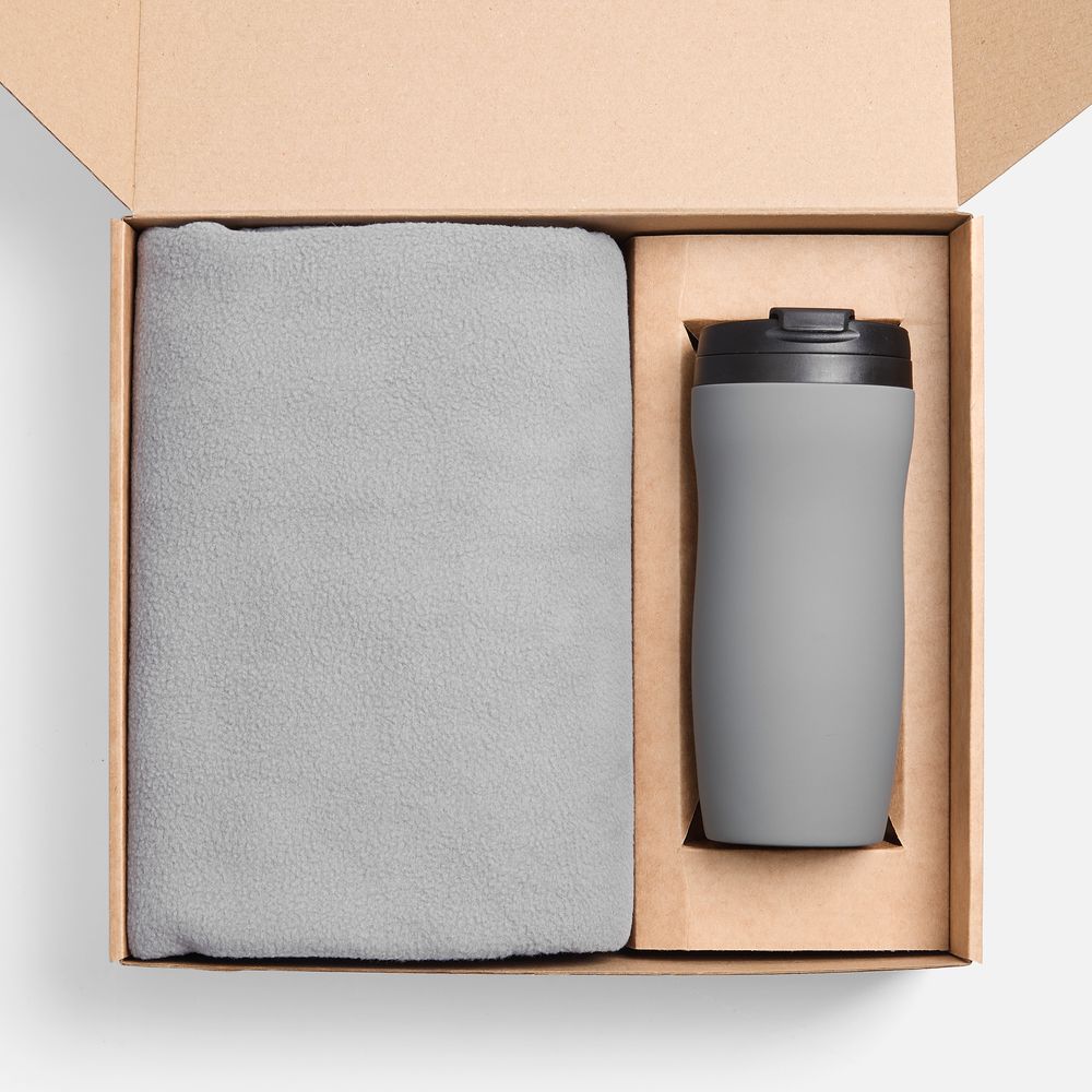 крышка, внутренняя колба - пластик; корпус - нержавеющая сталь; покрытие софт-тач; плед - флис, плотность 180 г/кв.м; коробка - микрогофрокартон, Т-23Е