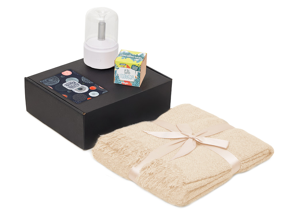 плед - 100% акрил, увлажнитель-аромадиффузор - АБС палстик, поликарбонат, набор для выращивания - дерево, мешок - нетканый материал (спанбонд), коробка - картон