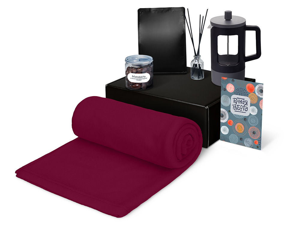 плед - флис, полиэстер, кофе - пластик, френч-пресс - нержавеющая сталь, боросиликатное стекло, ПП пластик, диффузор - стекло, миндаль - пластик, мешок - нетканый материал (спанбонд), коробка - картон