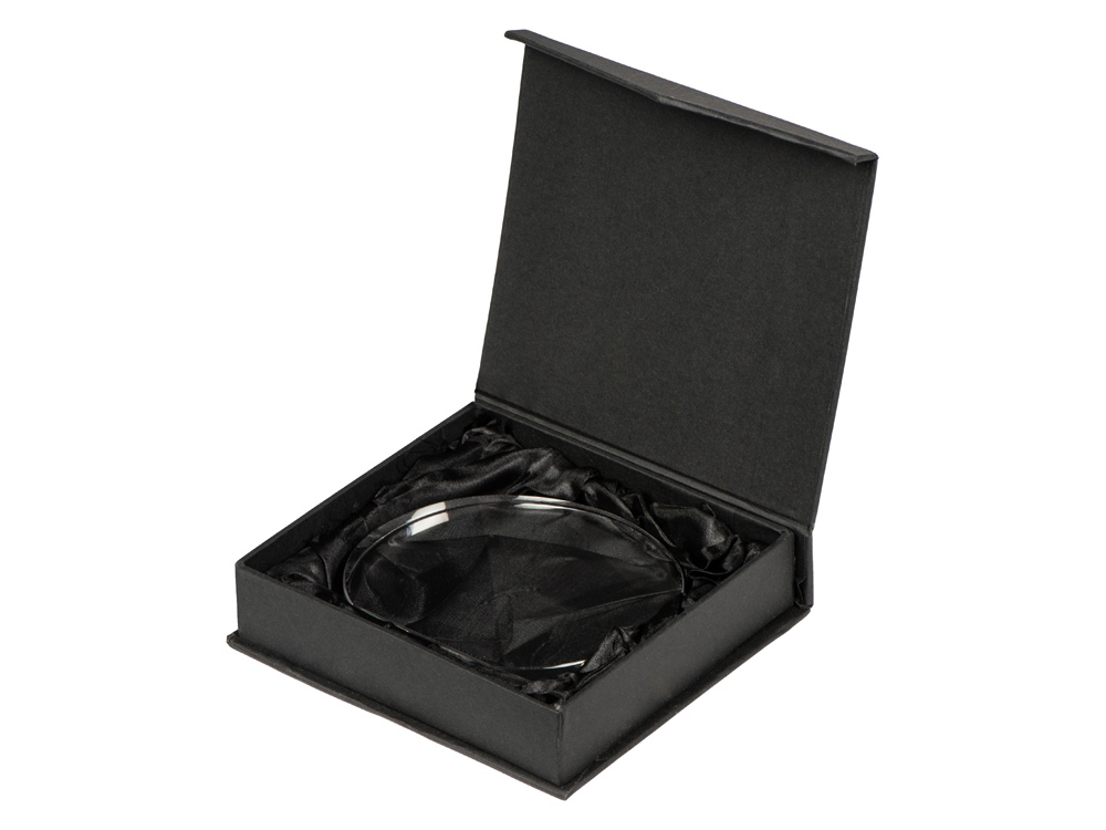 Награда выполнена в форме срезанного с одной стороны круга, что позволяет её поставить без специального основания. Она предельно минималистична и компактна.