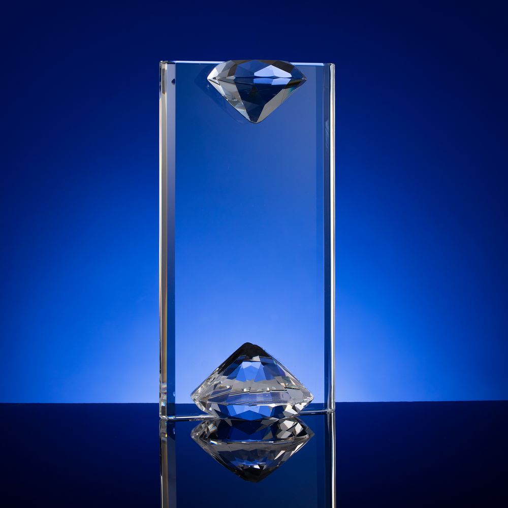 Стела Incrystal — воплощение минимализма, приправленного двумя привлекательными акцентами. Крупные детали в форме эффектных алмазов у основания и в навершии образуют гармоничное единство, олицетворяя сильные стороны, устремленность к единой цели и особую ценность получателя награды. Свет красиво преломляется в гранях этих алмазов, создавая приятный визуальный эффект и добавляя стеле оттенок роскоши.