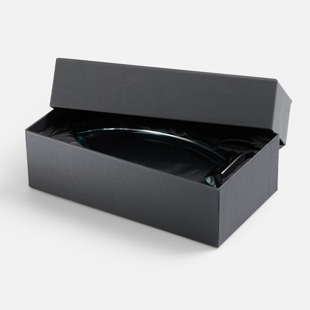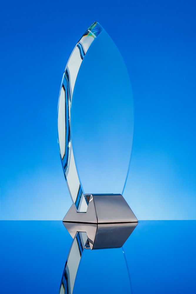 Конструкция награды разъемная: стеклянную часть стелы при необходимости можно вынуть из основания. -