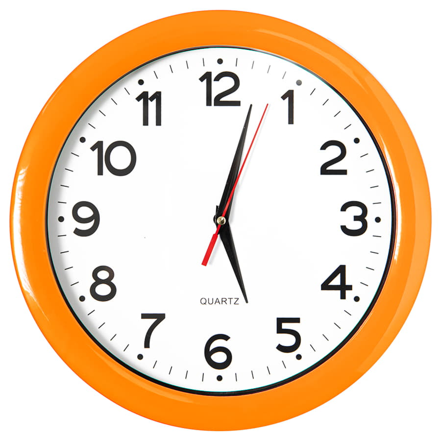 Pantone 151C Часы настенные с кварцевым механизмом, работают от 1 батарейки АА. Предназначены для вставки циферблата с печатью по индивидуальному дизайну Комплектация: 1) корпус с часовым механизмом, 2) минеральное стекло, 3) ободок, 4) стрелки - 3 шт. (часовая и минутная стрелки - черного цвета, секундная - красного цвета). Для удобства вставки циферблата с печатью по индивидуальному дизайну, стрелки часов не зафиксированы и поставляются в отдельном пакетике) 5) Муляж циферблата (диаметр 235 мм) Для вставки используется мелованная бумага матовая 300 гр. -