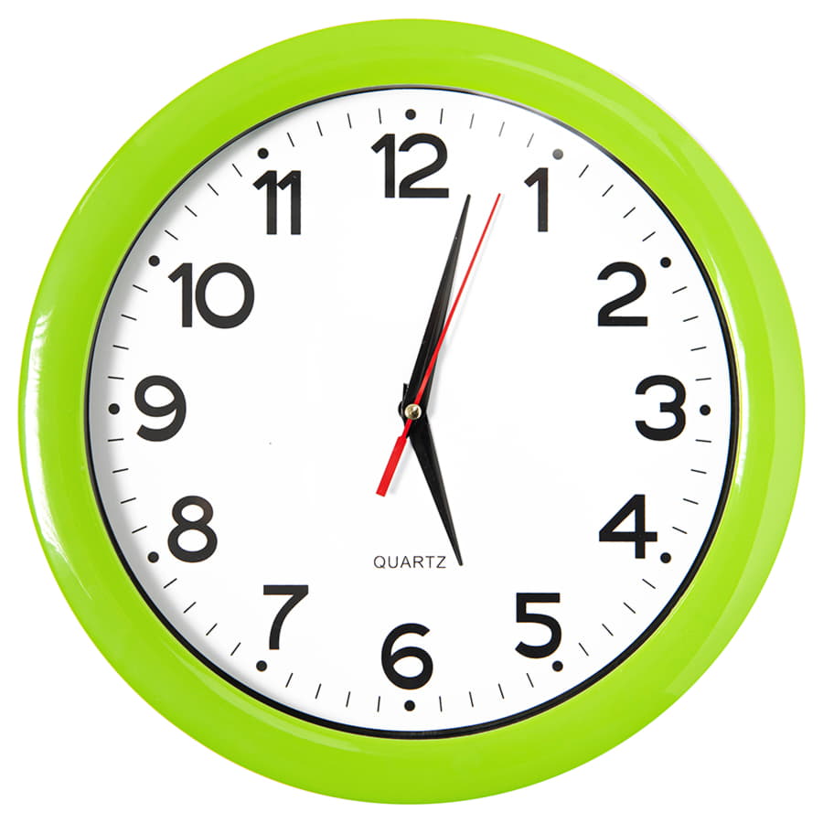 Pantone 368 C. Часы настенные с кварцевым механизмом, работают от 1 батарейки АА. Предназначены для вставки циферблата с печатью по индивидуальному дизайну Комплектация: 1) корпус с часовым механизмом, 2) минеральное стекло, 3) ободок, 4) стрелки - 3 шт. (часовая и минутная стрелки - черного цвета, секундная - красного цвета). Для удобства вставки циферблата с печатью по индивидуальному дизайну, стрелки часов не зафиксированы и поставляются в отдельном пакетике) 5) Муляж циферблата (диаметр 235 мм) Для вставки используется мелованная бумага матовая 300 гр. -