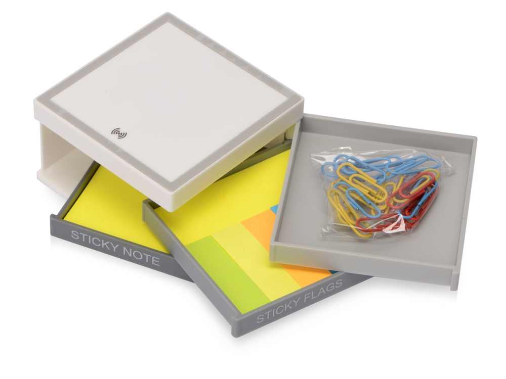 Органайзер Chaos с функцией беспроводной зарядки – современный бизнес-подарок, объединяющий в себе функциональность и современный подход к организации рабочего пространства. Три выдвигающиеся подставки уже содержат скрепки, самоклеящиеся стикеры и стикеры-закладки. Органайзер подходит для беспроводной зарядки и хранения смартфона, поддерживающего функцию беспроводной зарядки, и различных канцелярских аксессуаров. Работает от кабеля Micro-USB. В комплект входит кабель Micro-USB. -