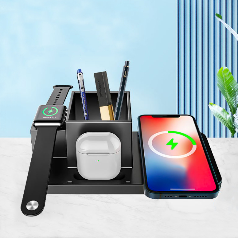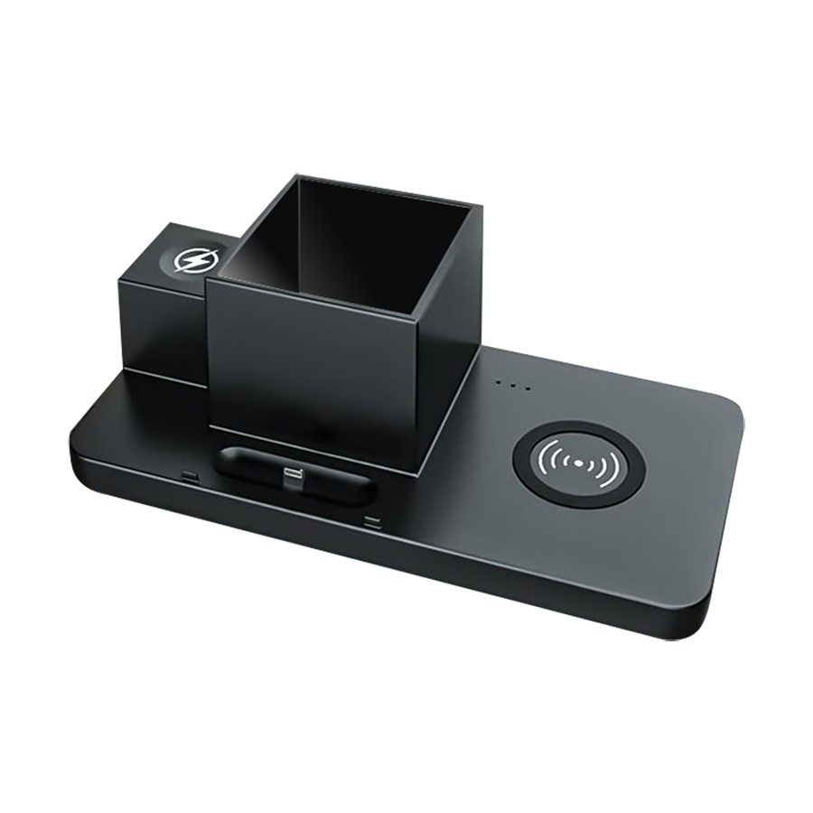 С настольным органайзером Medow вы всегда сможете поддерживать порядок на столе и заряжать свои устройства, не отвлекаясь от работы. Это идеальный аксессуар для современного офиса! Основные характеристики: ✔️ Материал: Пластик ABS, обеспечивающий долговечность и современный внешний вид ✔️ Мощность беспроводной зарядки: 15W, что позволяет быстро и эффективно заряжать ваши устройства ✔️ Разъем: Type-C, что обеспечивает универсальность подключения Настольный органайзер Medow предлагает три области для зарядки аксессуаров, а также удобную подставку для канцелярских принадлежностей. Это делает его идеальным помощником для организации рабочего процесса Технические характеристики: - Входное напряжение и ток:9v-1.6A/5V-2A - Выходное напряжение и ток:9v-1.6A/5V-2A - Мощность беспроводного зарядного:15W - Мощность беспроводного зарядного для часов:3W - Мощность беспроводного зарядного airpods:5W - Магнит: Да. Поддерживаемые устройства: 1) Область зарядки смартфона поддерживает все Android/Ios устройства с функцией беспроводной зарядки. 2) Область зарядки наушников поддерживает все Android/Ios устройства с функцией беспроводной зарядки. 3) Область зарядки часов поддерживает только устройства AppleWatch Для работы беспроводной зарядки необходимо подключать устройство к сети через адаптер.- Виды нанесений: УФ-печать А2