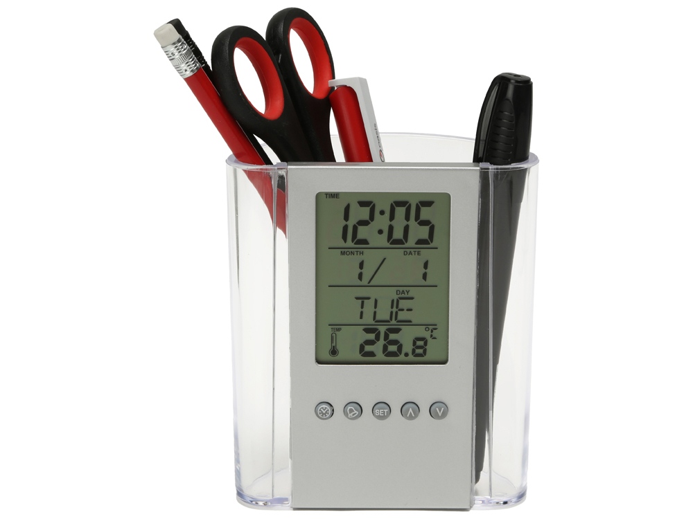 Чрезвычайно практичный элемент Вашего рабочего стола подскажет время, температуру и даже дату, а ещё вместит в себя канцелярские принадлежности. Часы оснащены будильником. Полный порядок на столе плюс комфорт за приемлемую цену. -