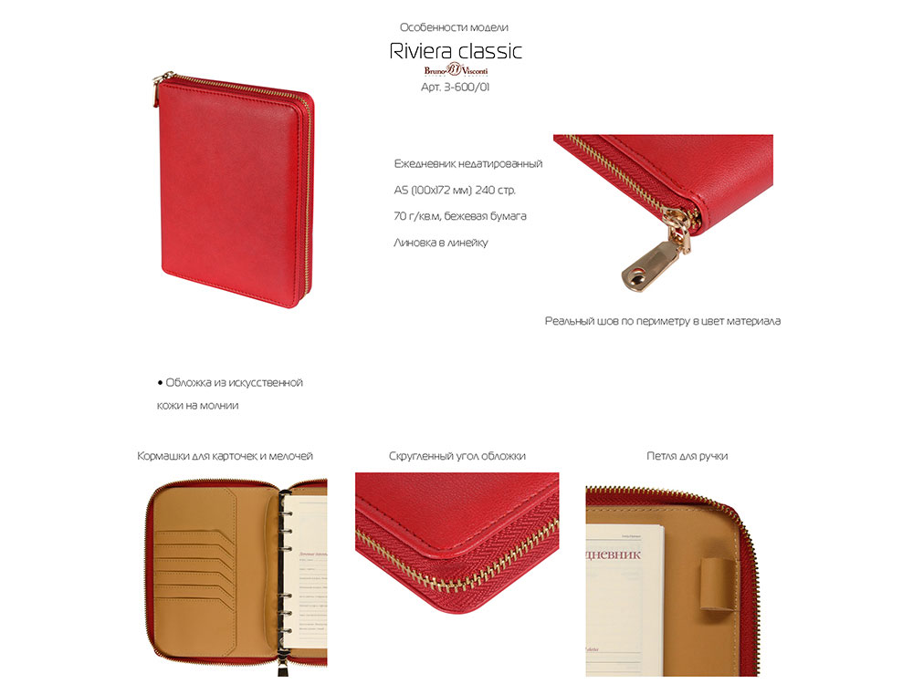 Великолепный ежедневник из качественной искусственной кожи, который заменит вам портмоне и органайзер. В ежедневнике предусмотрены карманы для карточек, сменный блок на кольцах. Внутри достаточно места для ручки и даже для мобильного телефона. Сам ежедневник закрывается на молнию. Его удобно брать с собой и на переговоры, и на деловой обед. Блок отпечатан в 2 цвета на бежевой бумаге плотностью 70 г/м2. -