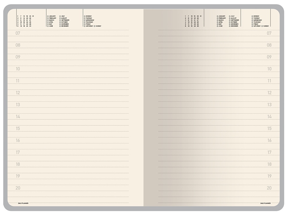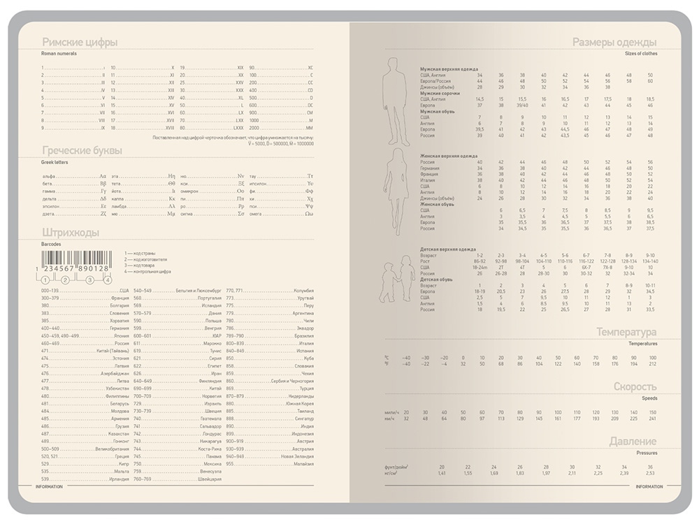 Недатированные страницы в серую линейку имеют отдельное место для проставления числа месяца и дня недели. Справочный блок на 17 страницах содержит полезную информацию из различных областей.