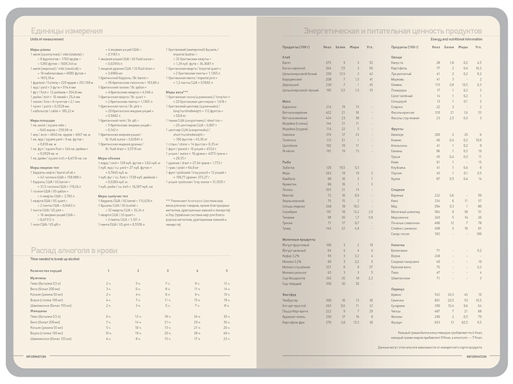 Недатированные страницы в серую линейку имеют отдельное место для проставления числа месяца и дня недели. Справочный блок на 17 страницах содержит полезную информацию из различных областей.