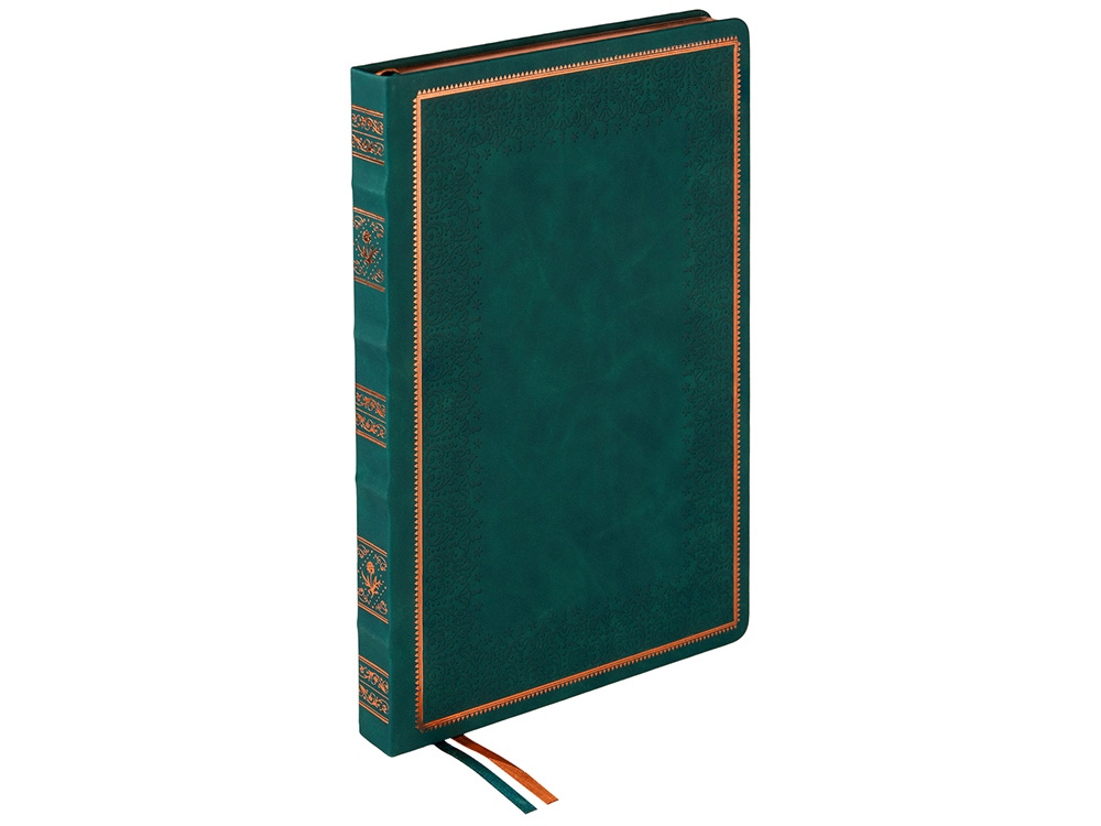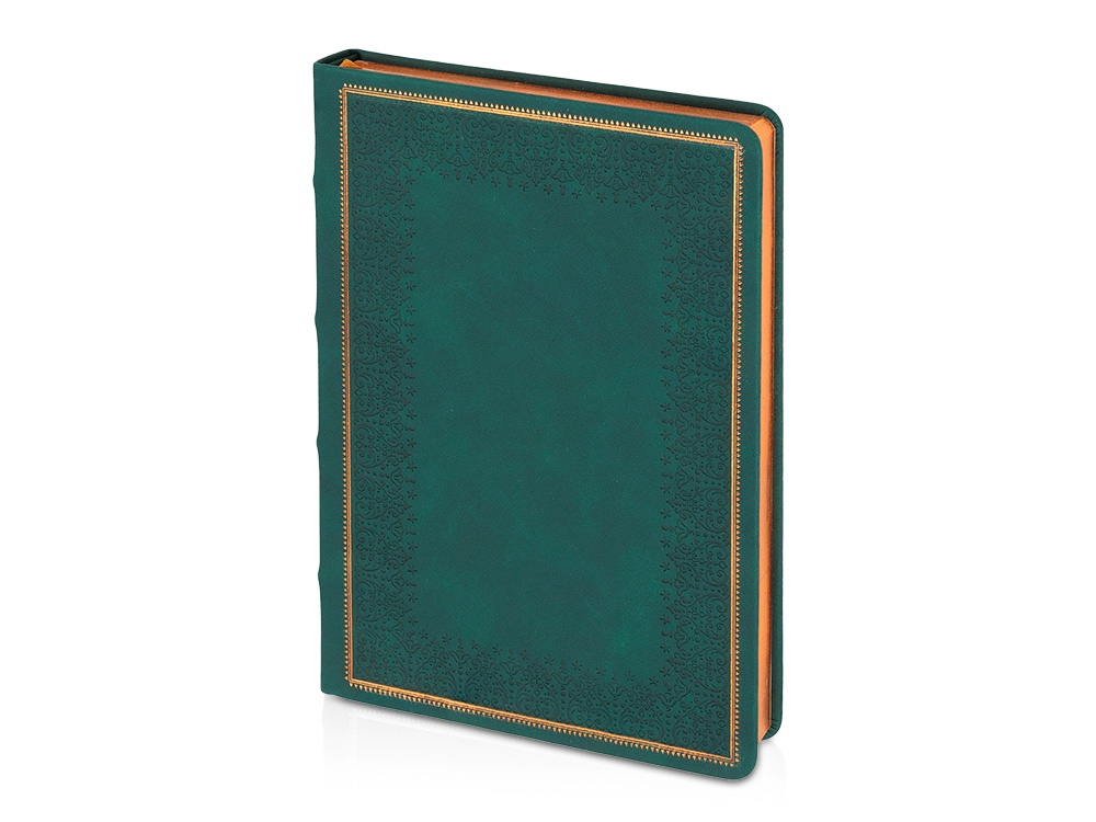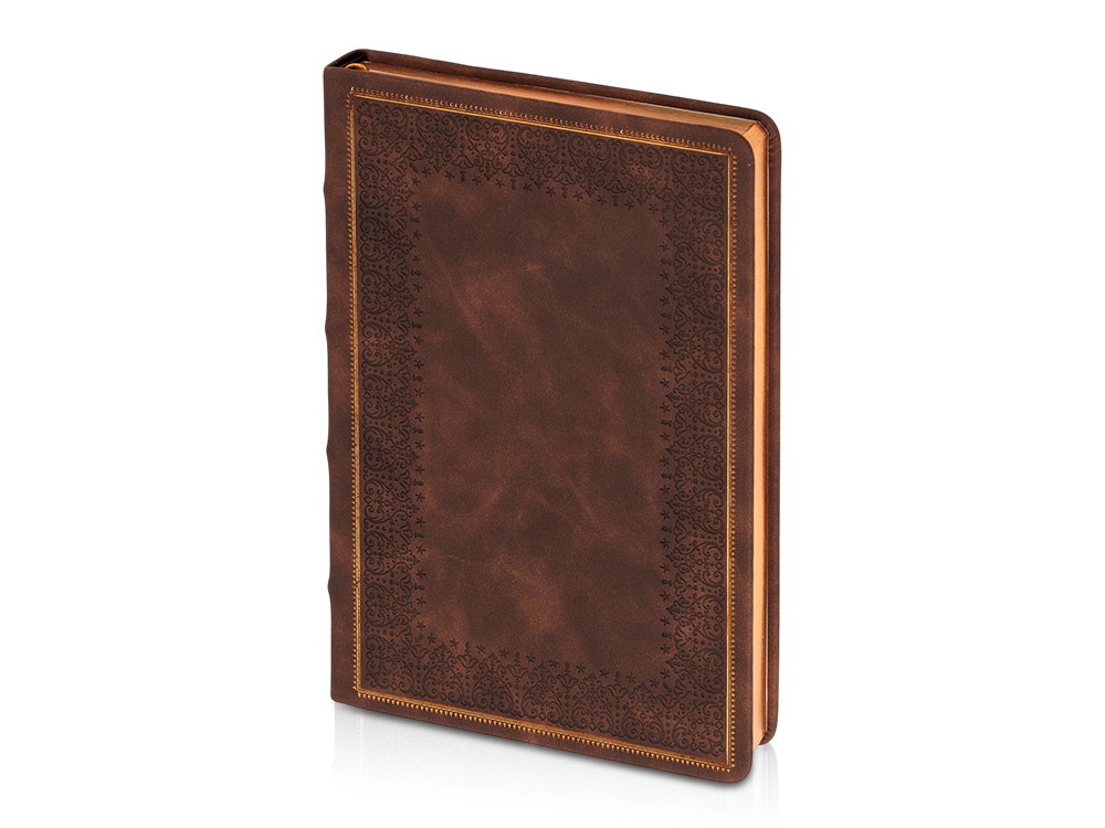 Недатированный ежедневник Royal формата А4 с твердой обложкой из искусственной кожи с имитацией нубука украшен художественным бронзовым и блинтовым тиснением. Внутри 192 страницы, выполненные из качественной бежевой бумаги в линейку плотностью 140 г/м². Два шелковых ляссе в цвет обреза блока и обложки облегчают навигацию по записям. Французский корешок дополнительно декорирован изящным бронзовым тиснением в виде виньеток. Скругленные углы обложки и блока подчеркивают стильный дизайн изделия, а блеск бронзового обреза дарит ежедневнику благородный и роскошный внешний вид. -