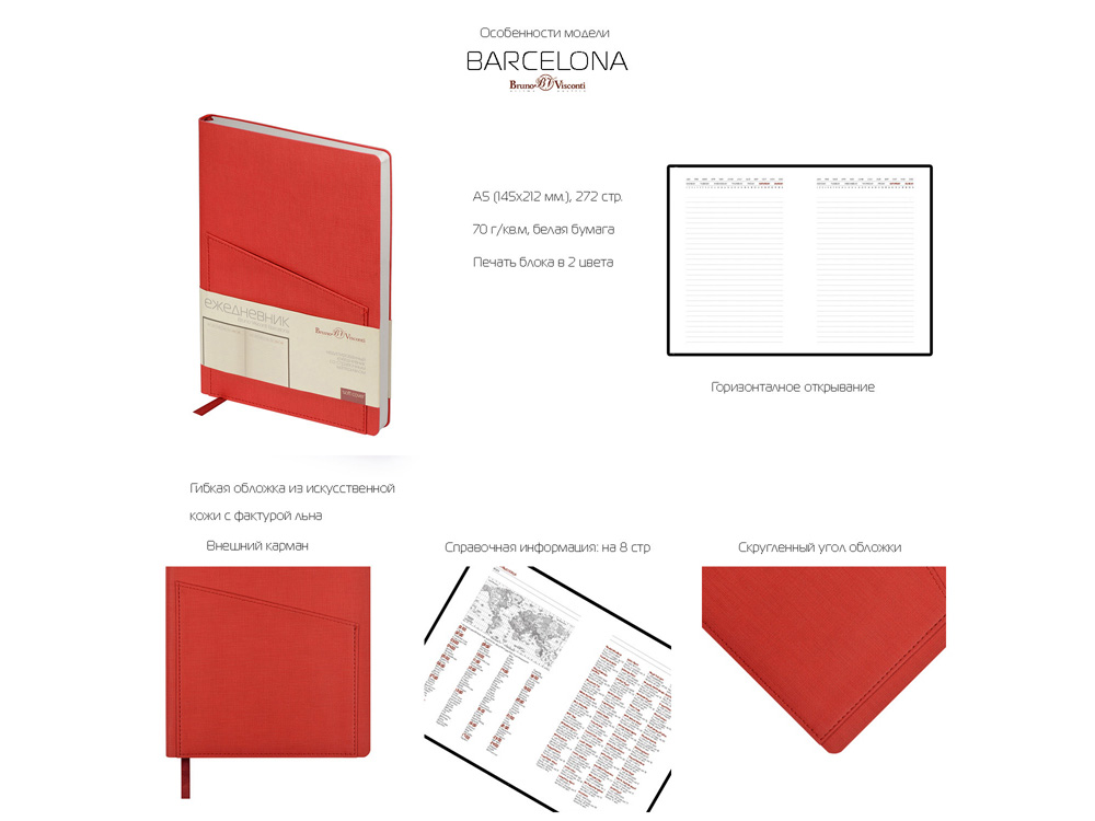 Это ежедневник предназначен для тех, кто отдает предпочтение строгости. Телефон, ручка, визитки и листы для записей будут всегда под рукой благодаря удобному карману на фронтальной стороне. В недатированном ежедневнике Barcelona черного цвета используется белая бумага плотность 70 г/м. Ляссе благородного бордового цвета сочетается с обложкой. Скругленный угол - фирменная особенность ежедневников Bruno Visconti. Справочная информация на 8 страницах. Ежедневник Barcelona упаковывается в картонный полукороб и термопленку. -