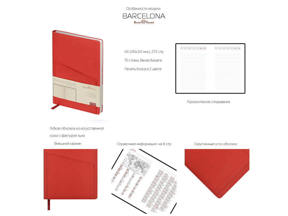 Это ежедневник предназначен для тех, кто отдает предпочтение строгости. Телефон, ручка, визитки и листы для записей будут всегда под рукой благодаря удобному карману на фронтальной стороне. В недатированном ежедневнике Barcelona красного цвета используется белая бумага плотность 70 г/м. Ляссе благородного бордового цвета сочетается с обложкой. Скругленный угол - фирменная особенность ежедневников Bruno Visconti. Справочная информация на 8 страницах. Ежедневник Barcelona упаковывается в картонный полукороб и термопленку. -