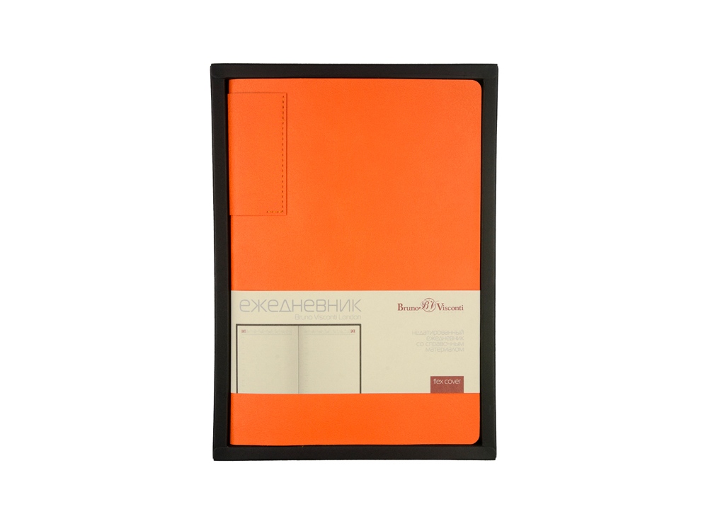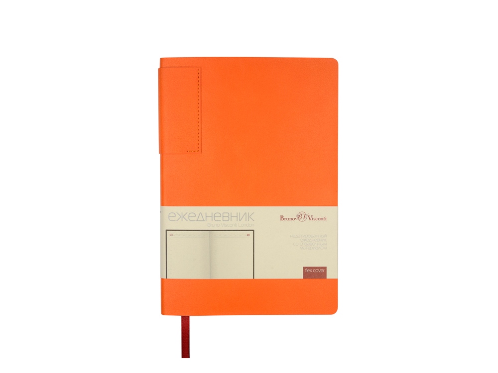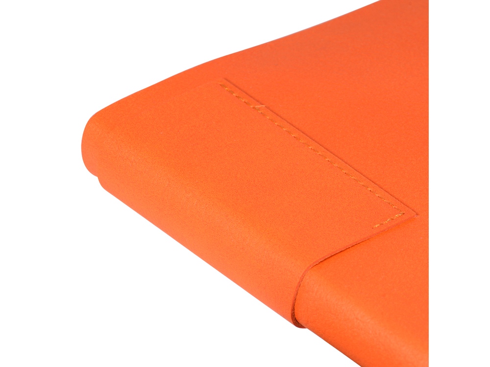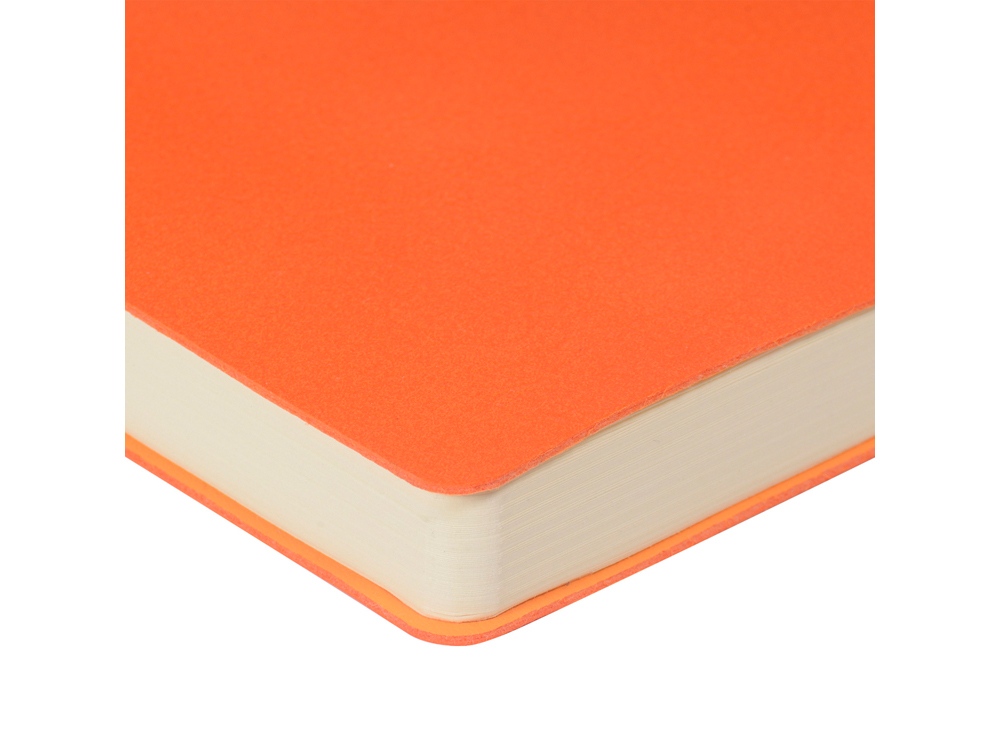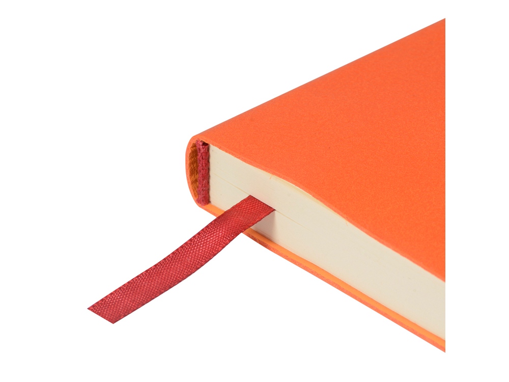 Лаконичная модель в ярком исполнении: гибкая обложка оранжевого цвета с контрастной или в цвет обложки нашивкой. Выполнен из качественной и прочной искусственной кожи, крепление внутреннего блока - книжный переплет, закладка- ляссе. Углы обложки скруглены.