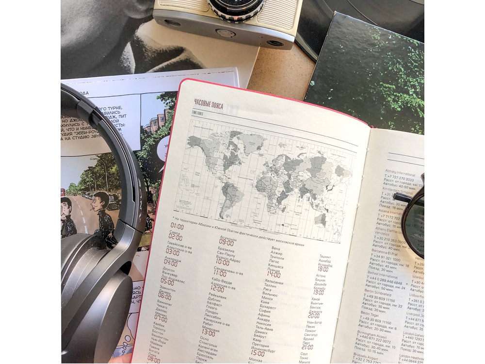 Внутри есть страница для личных данных, а также блок справочной информации (часовые пояса, аэропорты, телефонные коды, размеры одежды, автомобильные коды, римские цифры, расход калорий, формат бумаги, единицы измерения, штрихкоды, распад алкоголя в крови, города миллионники РФ и СНГ, национальные праздники, термины международной торговли, температура, скорость, давление, буквенные коды стран, энергетическая ценность продуктов, страны мира). -