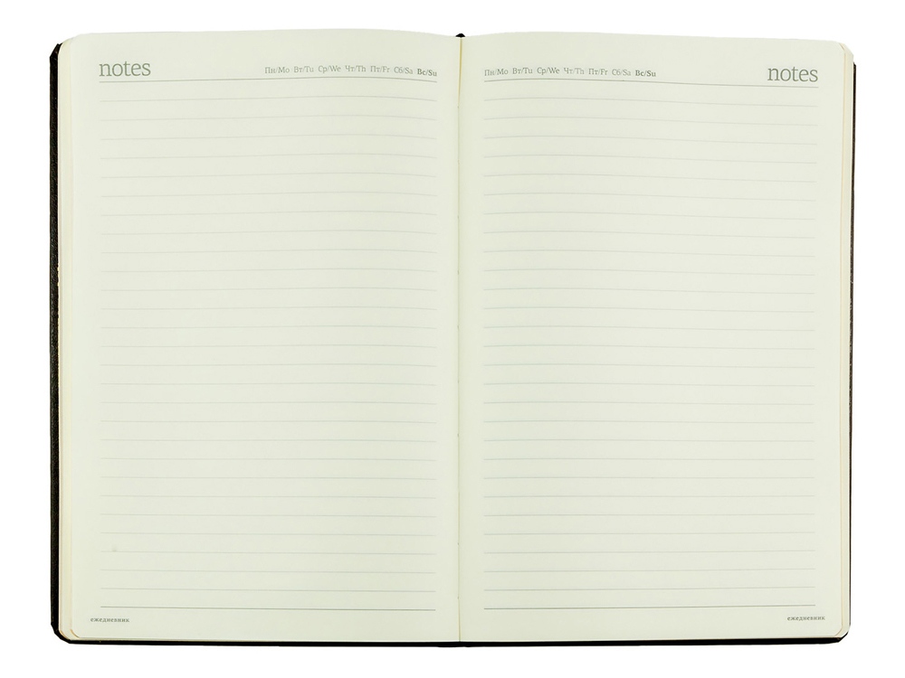 Ежедневник выпускается в универсальном формате А5. Размер обложки – 144*215 мм. В недатированном блоке для записей 320 страниц из тонированной бумаги бежевого цвета. Бумага плотностью 70 г/м2.