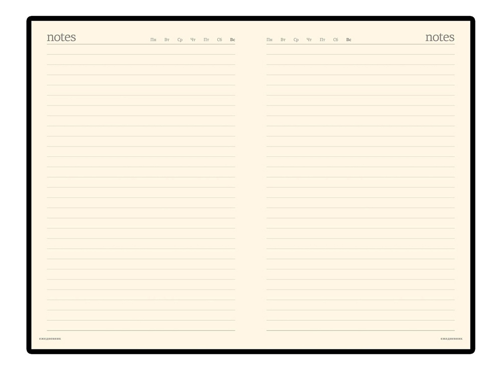 Ежедневник выпускается в универсальном формате А5. Размер обложки – 144*215 мм. В недатированном блоке для записей 320 страниц из тонированной бумаги бежевого цвета. Бумага плотностью 70 г/м2.