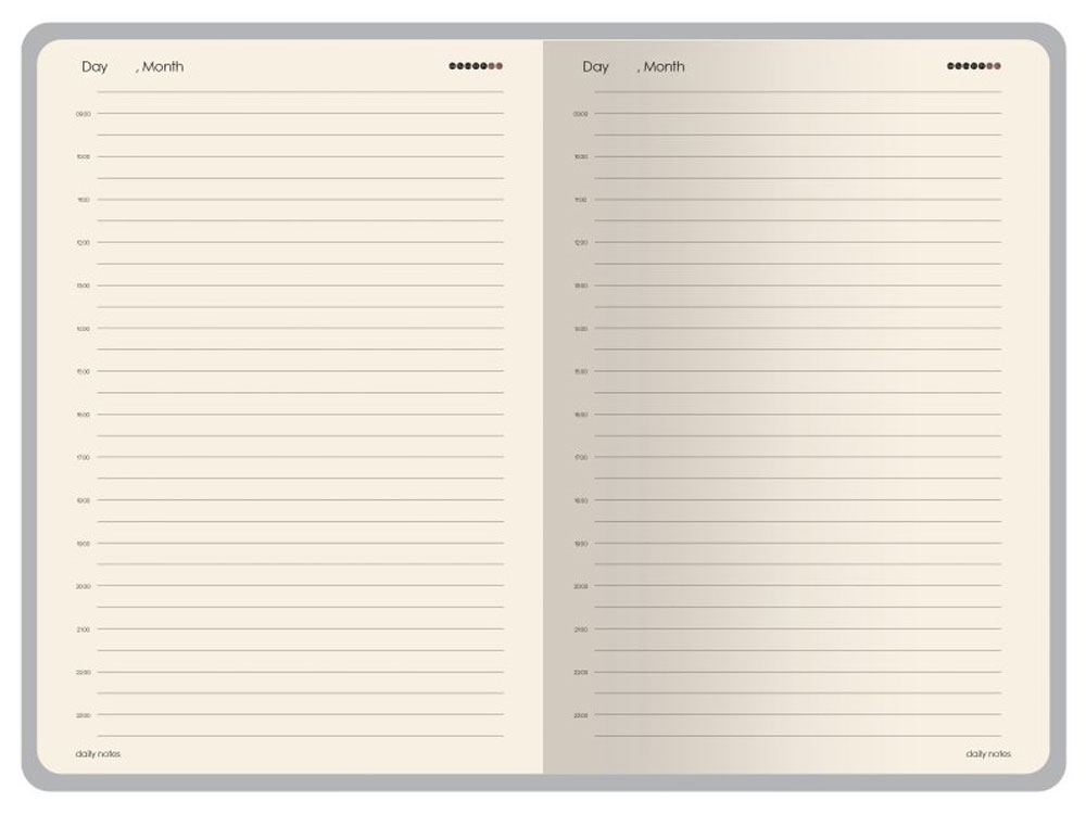 Отличительной особенностью ежедневника является горизонтальная, скрепляющая обложку и блок, тоненькая резинка. Оригинальное решение позволяет раскрывать ежедневник на 180 градусов и вести записи у самого края корешка. Для фиксации второй резинки, не позволяющей ежедневнику раскрываться, предусмотрена выемка на обложке. Обложка тонка, но фактурность придает ей элемент брутальности, а бархатистое нанесение на ее оборотной стороне- благородство и статусность. Картонный карман для визиток, записок, бумаг – функциональная деталь и приятная дополнительная опция. Бумажный блок изготовлен из бумаги бежевого цвета, плотностью 70 г/кв.м и содержит 272 страницы, 23 из которых справочная информация.