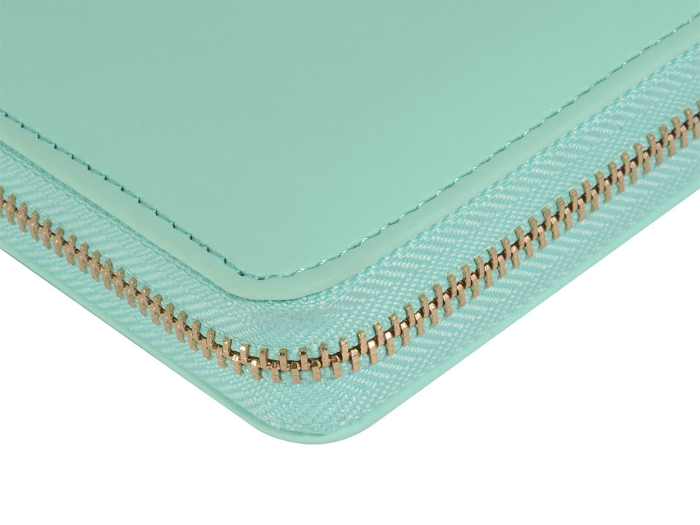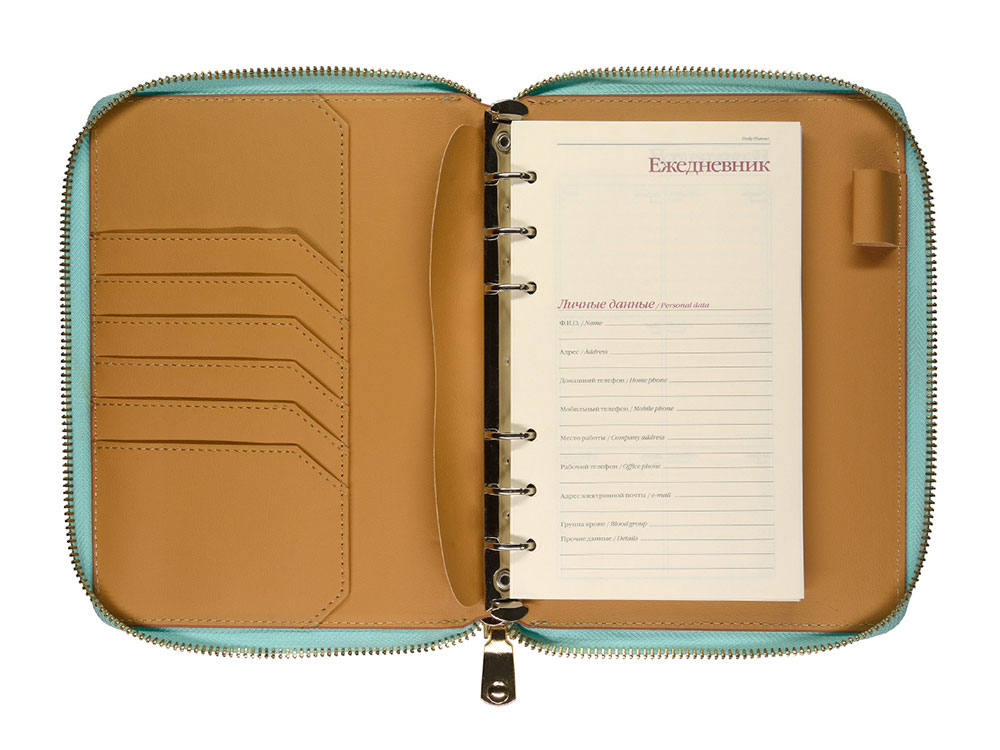Деловая нежность! Вот как можно охарактеризовать этот очаровательный зафирно-мятный ежедневник. Большое отделение на молнии вмещает в себя и сменный блок для записей на кольцевом механизме, и отделения для визиток и ручки. В этом бизнес-аксессуаре поместятся и дополнительные документы и смартфон. -