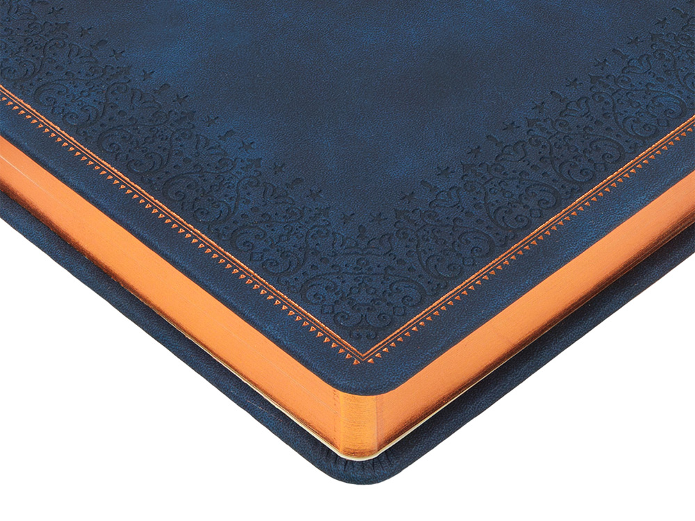 Недатированный ежедневник Royal формата А5 с твердой обложкой из искусственной кожи с имитацией нубука украшен художественным бронзовым и блинтовым тиснением. Внутри 256 страниц, выполненных из качественной бежевой бумаги в линейку плотностью 100 г/м². Два шелковых ляссе в цвет обреза блока и обложки облегчают навигацию по записям. Французский корешок дополнительно декорирован изящным бронзовым тиснением в виде виньеток. Скругленные углы обложки и блока подчеркивают стильный дизайн изделия, а блеск бронзового обреза дарит ежедневнику благородный и роскошный внешний вид. -