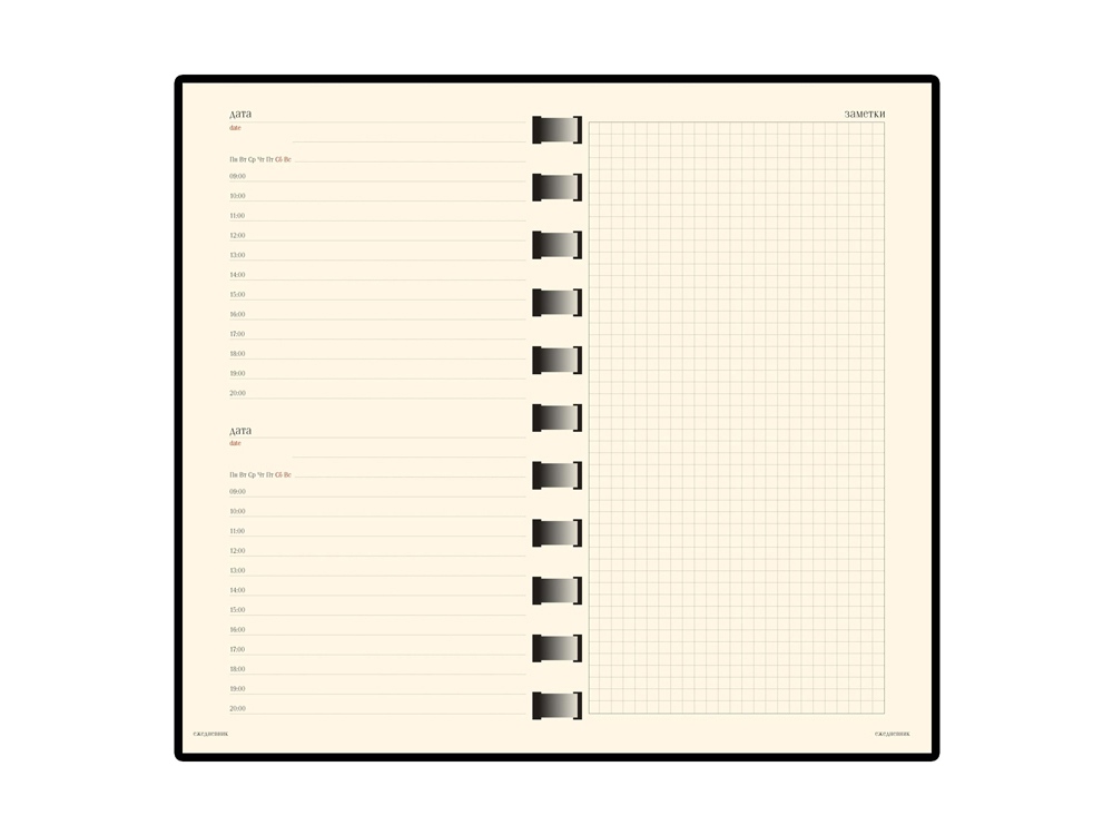 Это отличный формат для делового человека: у него есть внутрение кармашки для визиток(5 шт.) и съемный блок на спирали. Сменный блок состоит из листов со справочной информацией (20 стр.), листов в клетку и листов с телефонной книгой (18 стр. в линейку).