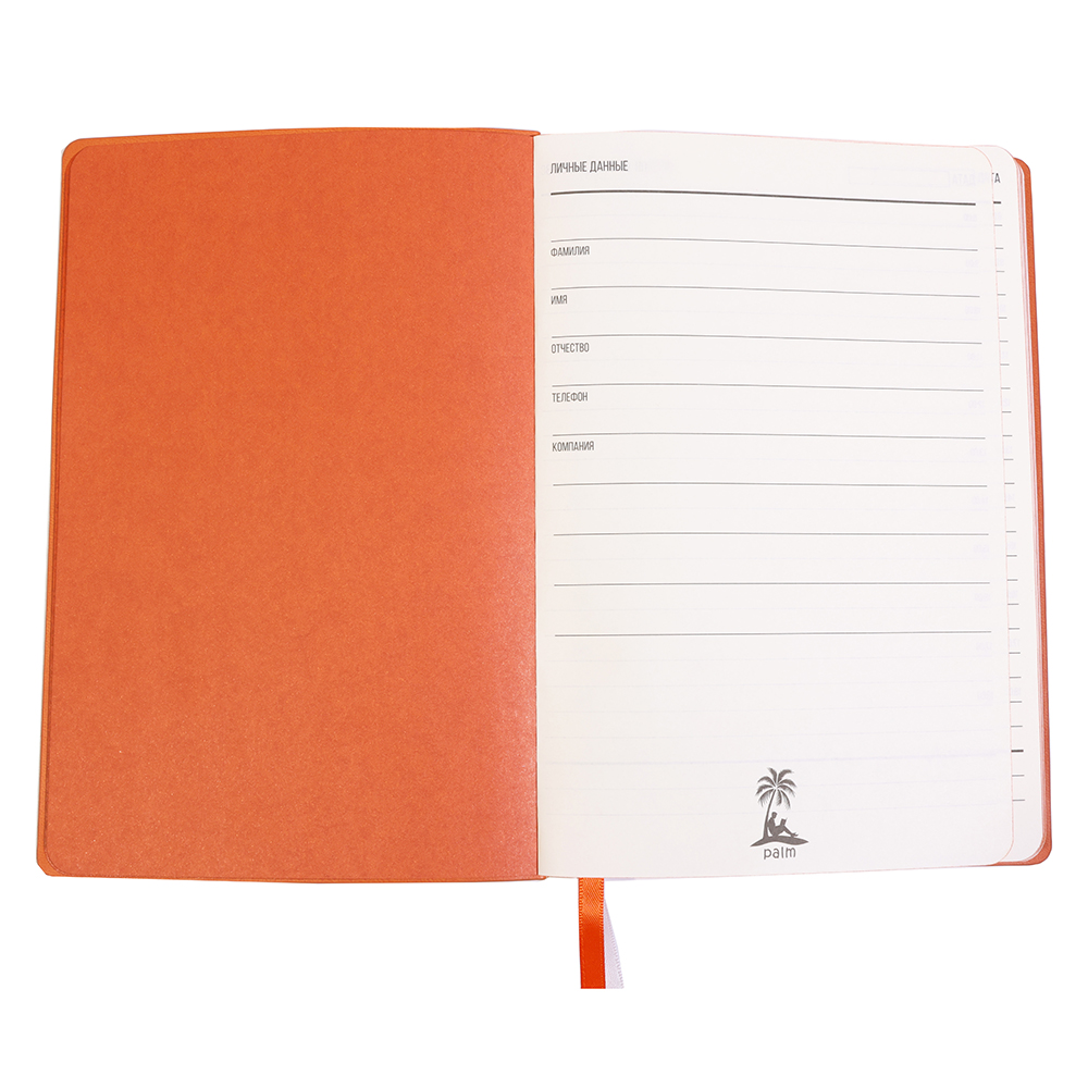 Высококачественный ежедневник Gabby в мягкой и приятной на ощупь обложке. Идеален для подарка! Удобный и стильный: закругленные углы, прокрашен в цвет ежедневника край, форзац и нахзац, а также одна из двух лент-закладок, вторая белая. Титульные листы — индивидуальные. Бумага в блоке — цвета слоновая кость. В начале ежедневника страничка с личными данными. Индивидуальная упаковка в термоусадочную пленку.Только вы, ваши мысли и PALM™. Блок внутренних страниц в линейку. Количество листов - 128.- Виды нанесений: УФ-печать А2, Тиснение, Тиснение фольгой, УФ-Лак, УФ-Цвет+Лак