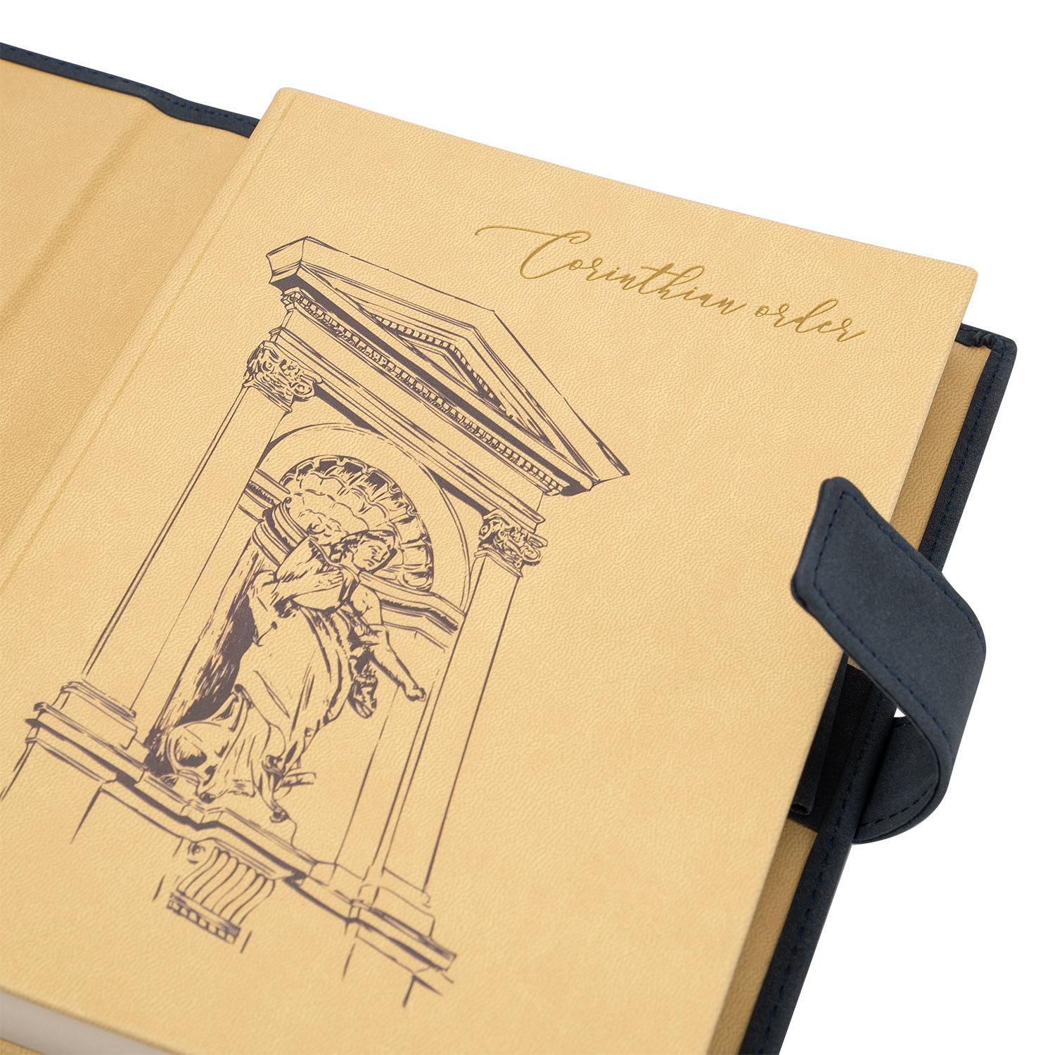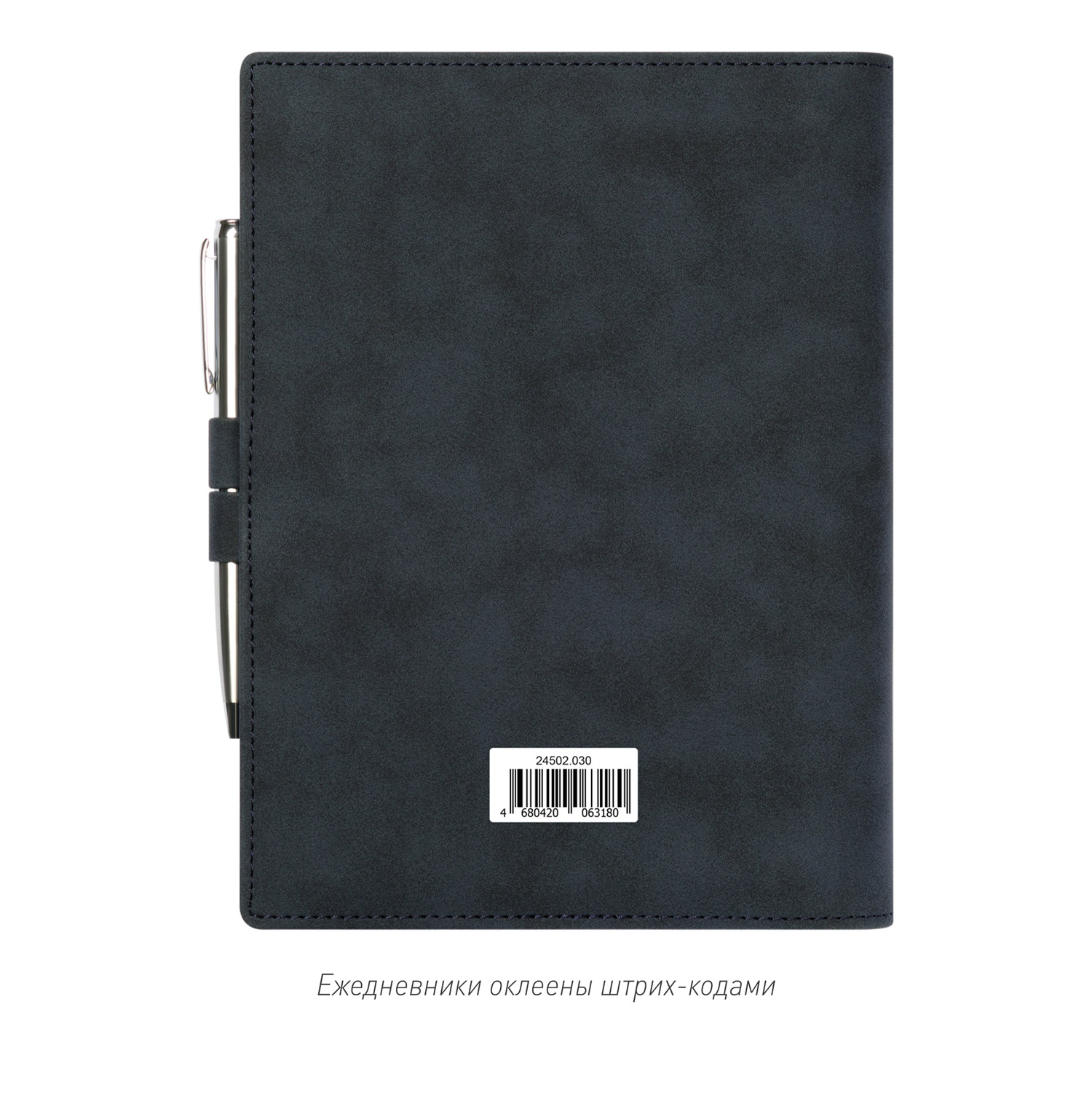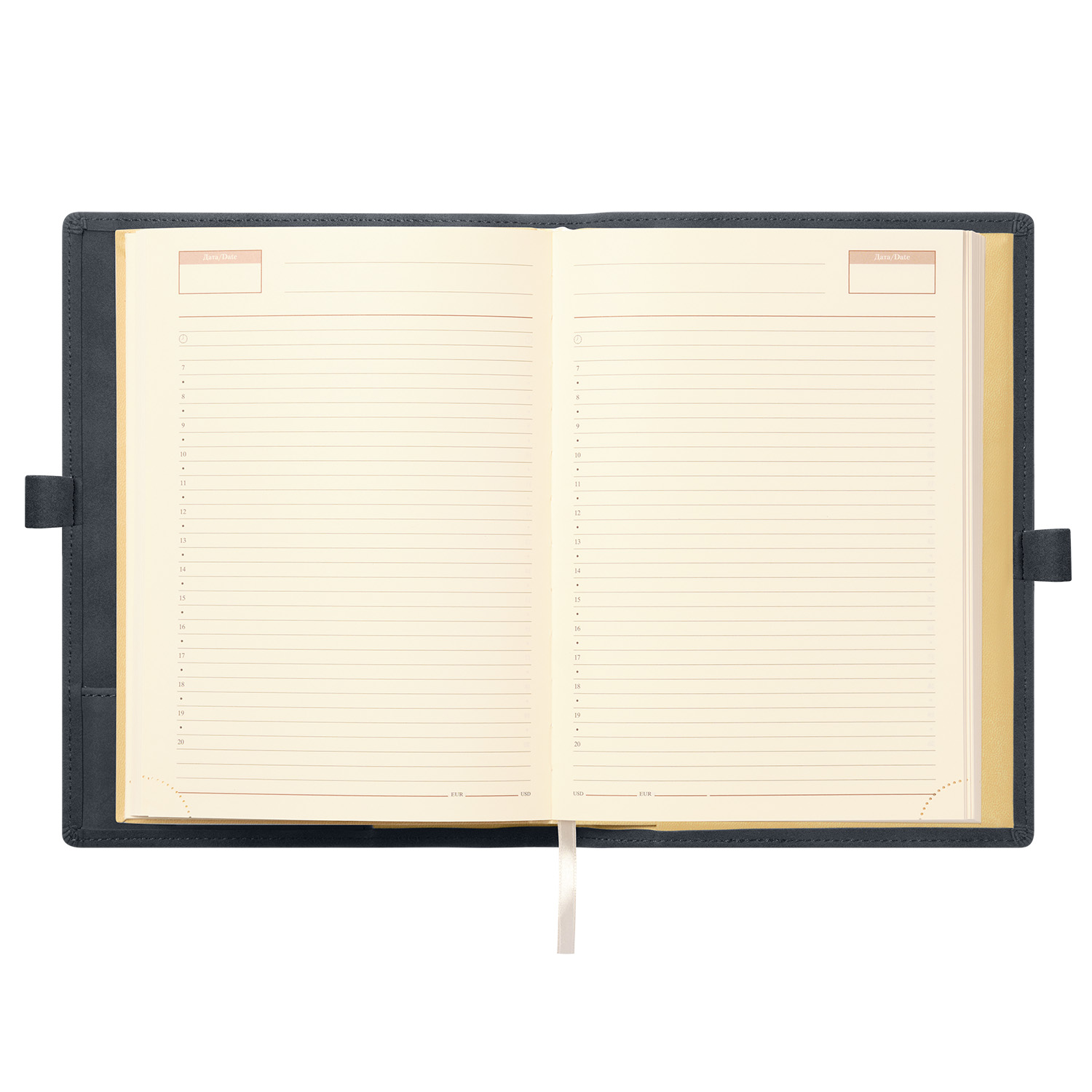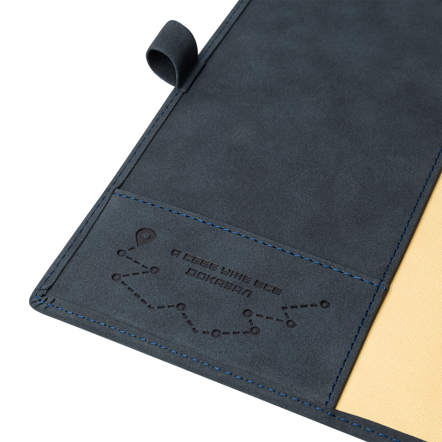 Застежка составлена из двух петель для ручки из материала и цвета обложки, расположенных на ее противоположных сторонах.