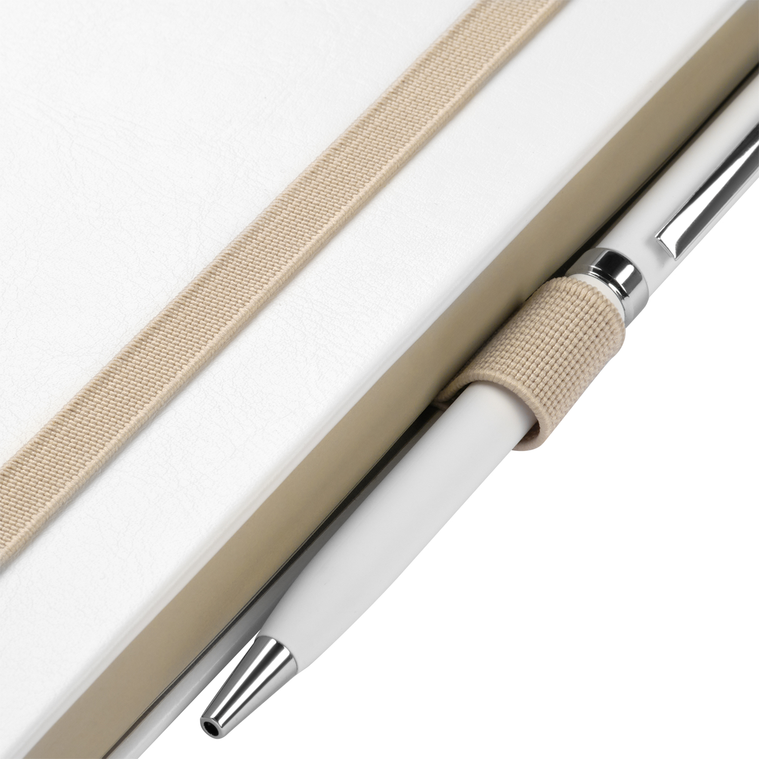 Недатированный ежедневник выполнен в жесткой обложке из искусственной кожи со скругленными уголками. Переплетный материал гладкий, с легкой естественной паутинкой морщин, имеет полуглянцевый блеск. Цвет – чистый белый. Серые матовые форзац и нахзац, а также серо-бежевый срез блока создают оригинальный динамичный цветовой ансамбль и подчеркивают белизну обложки. Страницы светло-кремового цвета, из гладкого офсета, слегка шелковистые, со скругленными уголками. Добавляют изделию мягкую комфортную теплоту. Двойное атласное ляссе составлено из серой и белой лент. Каждая шириной 6 мм, имеет легкий блеск. Вертикальная фиксирующая резинка прочная, надежная и удобная, в тон срезу. Есть петелька для ручки в тон резинки. Карман на заднем форзаце.