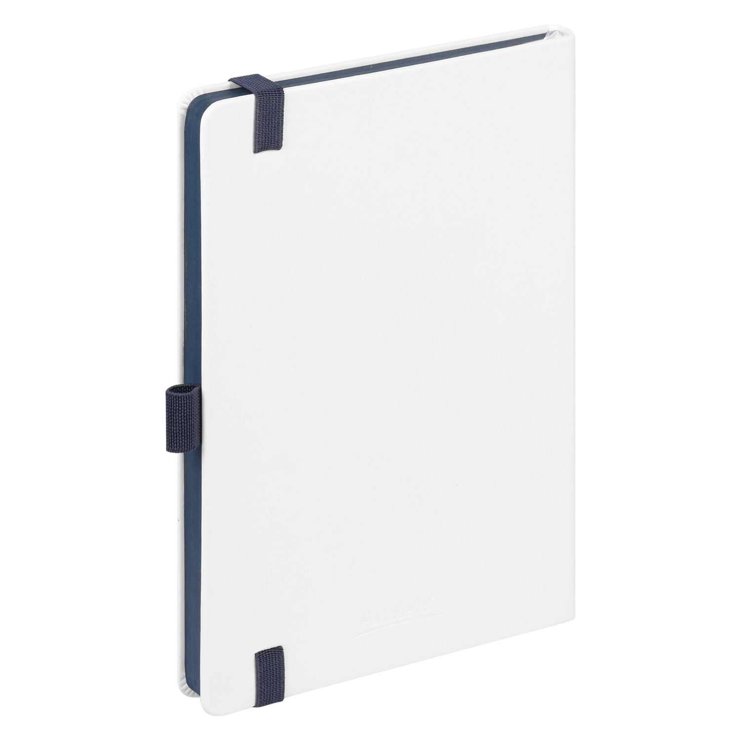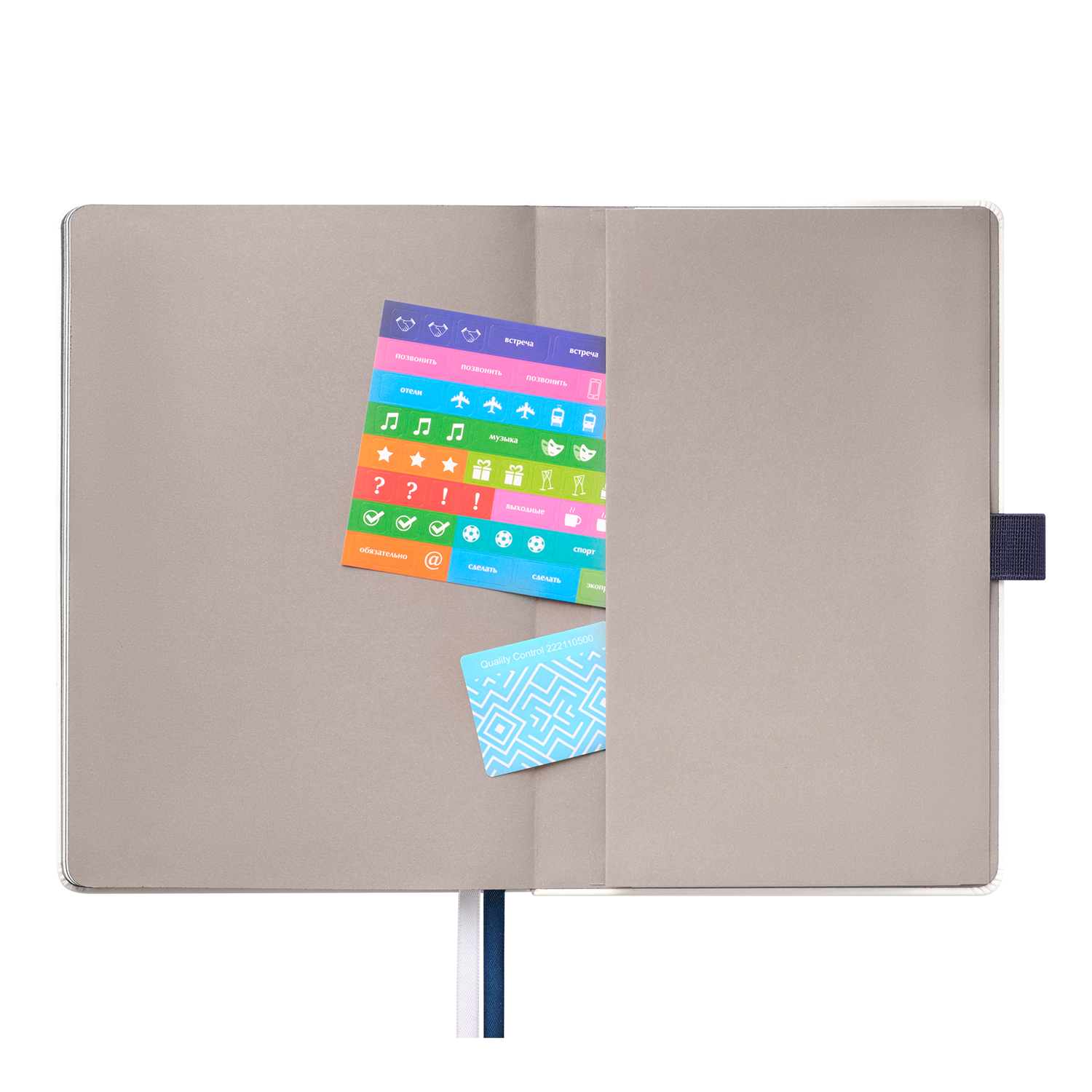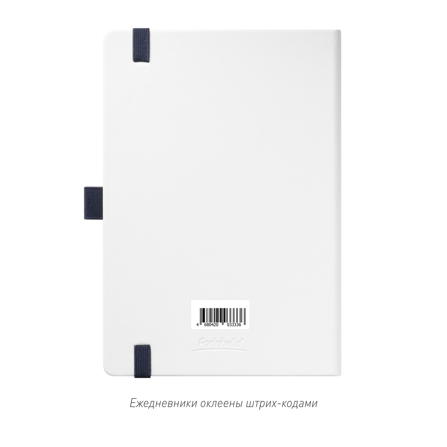 Недатированный ежедневник выполнен в жесткой обложке из искусственной кожи со скругленными уголками. Переплетный материал гладкий, с легкой естественной паутинкой морщин, имеет полуглянцевый блеск. Цвет – чистый белый. Серые матовые форзац и нахзац, а также синий срез блока создают оригинальный динамичный цветовой ансамбль и подчеркивают белизну обложки. Страницы светло-кремового цвета, из гладкого офсета, слегка шелковистые, со скругленными уголками. Добавляют изделию мягкую комфортную теплоту. Двойное атласное ляссе составлено из синей и белой лент. Каждая шириной 6 мм, имеет легкий блеск. Вертикальная фиксирующая резинка прочная, надежная и удобная, в тон срезу. Есть петелька для ручки в тон резинки. Карман на заднем форзаце.