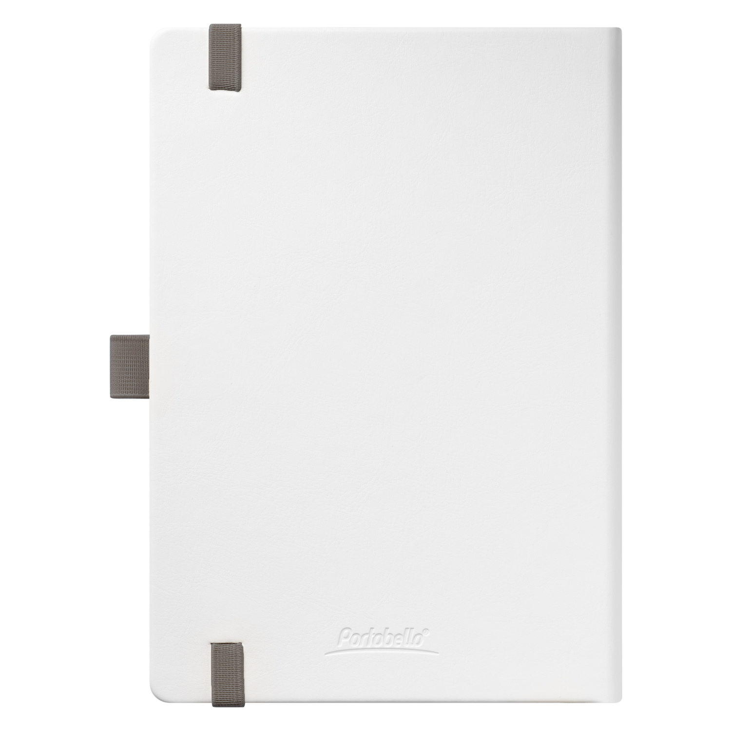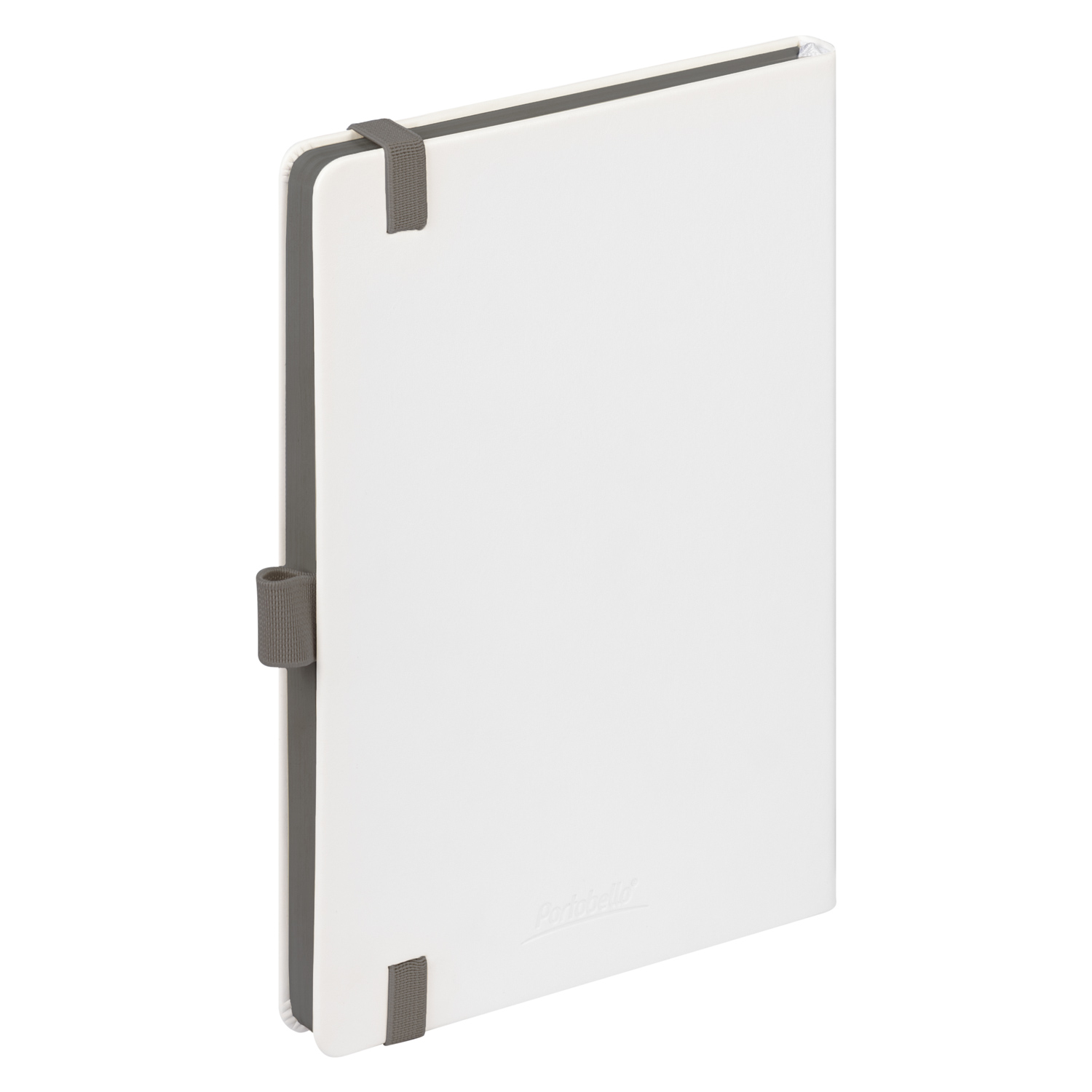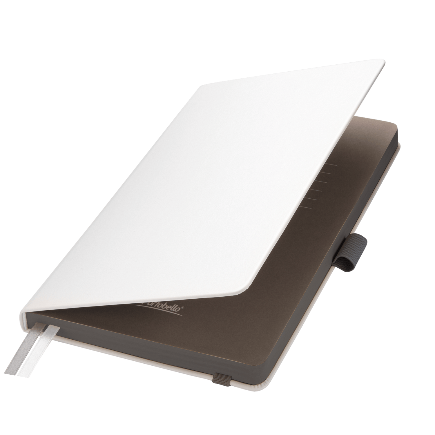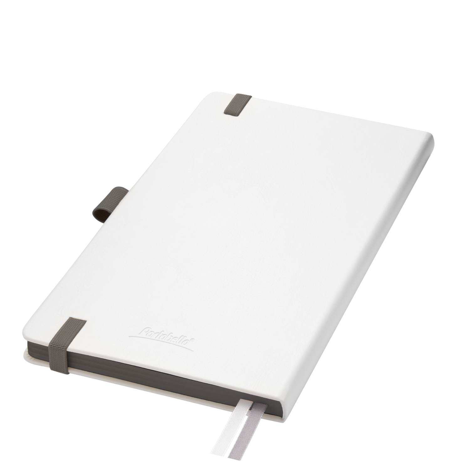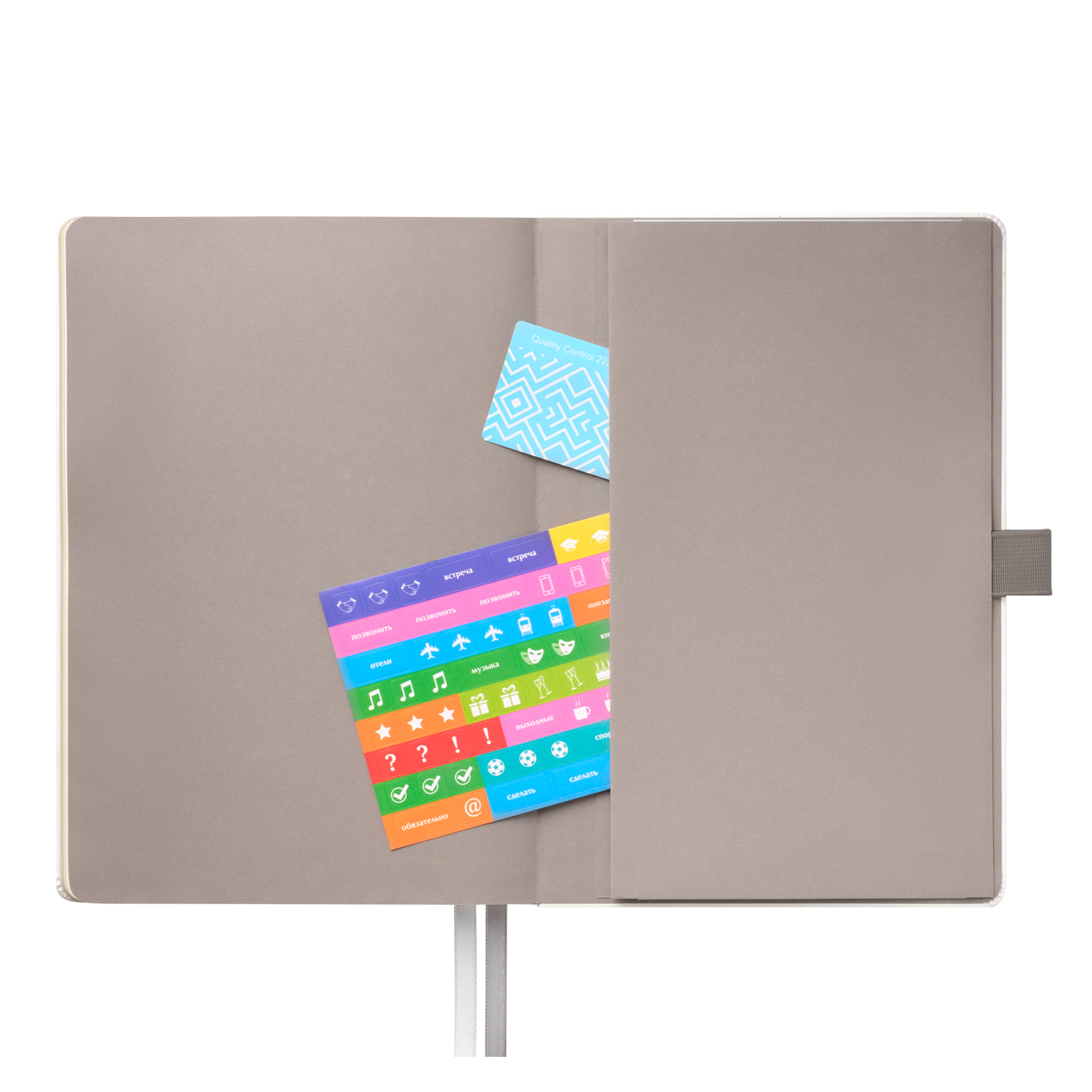 Недатированный ежедневник выполнен в жесткой обложке из искусственной кожи со скругленными уголками. Переплетный материал гладкий, с легкой естественной паутинкой морщин, имеет полуглянцевый блеск. Цвет – чистый белый. Темно-серые матовые форзац и нахзац, а также темно-серый срез блока создают оригинальный динамичный цветовой ансамбль и подчеркивают белизну обложки. Страницы светло-кремового цвета, из гладкого офсета, слегка шелковистые, со скругленными уголками. Добавляют изделию мягкую комфортную теплоту. Двойное атласное ляссе составлено из серой и белой лент. Каждая шириной 6 мм, имеет легкий блеск. Вертикальная фиксирующая резинка прочная, надежная и удобная, в тон срезу. Есть петелька для ручки в тон резинки. Карман на заднем форзаце.