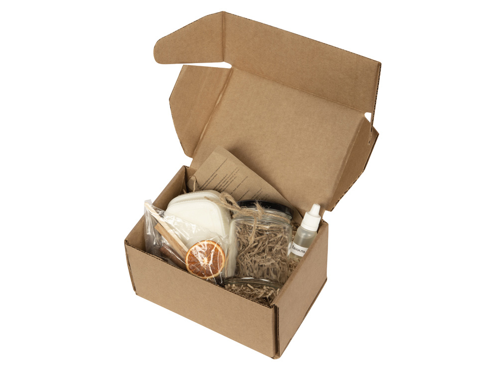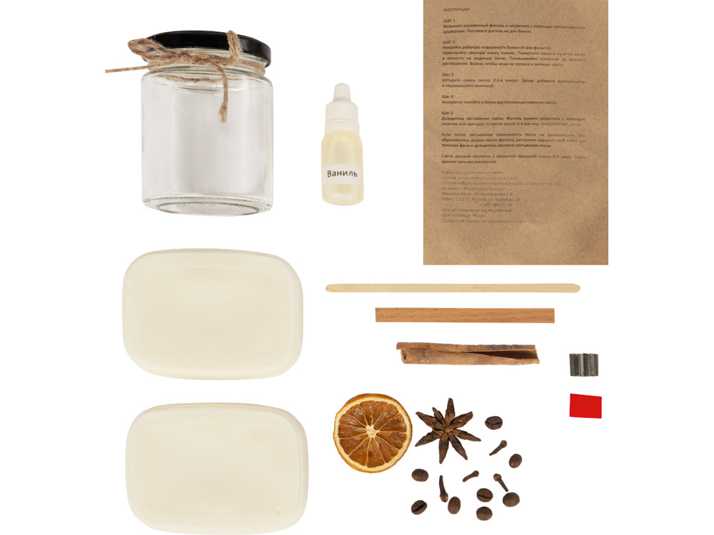 В набор входят сама свечная масса экологичного состава (соевый и кокосовый воск, пищевой парафин), стеклянная банка, деревянный фитиль и держатель, ванильный ароматизатор, специи и ленточка для декора.