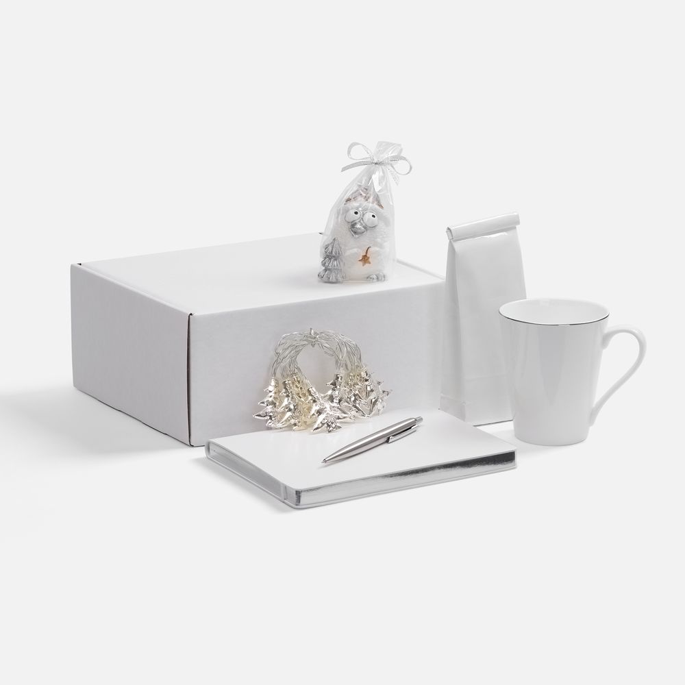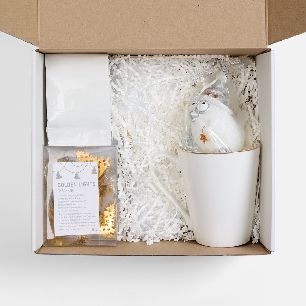 кружка - костяной фарфор; гирлянда - пластик, металл; свеча - парафин; ежедневник - искусственная кожа; ручка - металл
