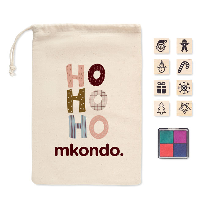 Набор из 8 деревянных рождественских штампов и разноцветной чернильницы (4 цвета). Поставляется в хлопчатобумажном мешочке на шнурке. -