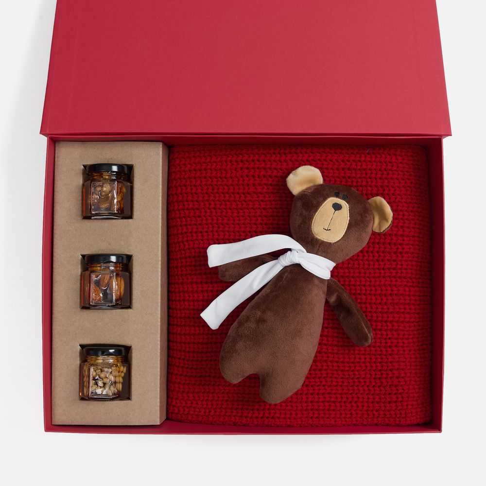 Милый мишка в шарфике с целой коллекцией разнообразного ароматного меда идеально дополняет основной, более практичный подарок — объемный шарф из толстой пряжи, который впишется в любой зимний образ. -