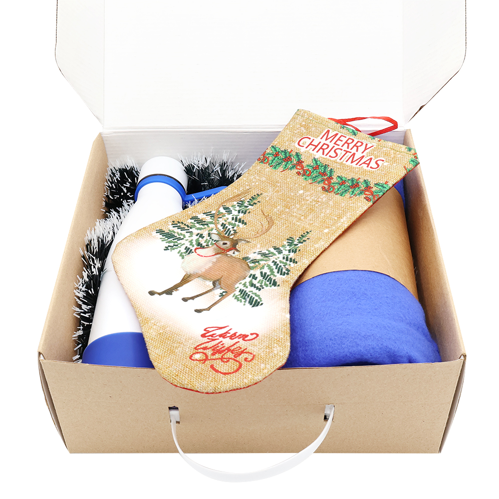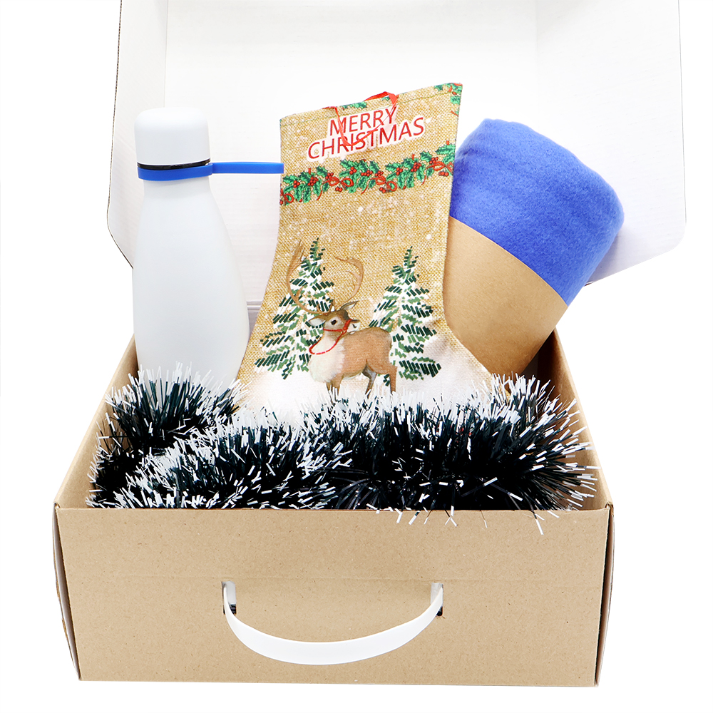 Этот подарочный набор подарит тепло и уют в холодное время года, создавая атмосферу праздника и комфорта. Идеальное сочетание практичности и праздничного настроения. Состав набора: Подарочная коробка из МГК (с ручкой) - артикул 53305 Плед PATIO, синий - артикул 16008.29 Вакуумная термобутылка Olivia, белый - артикул 5050.01, кольцо-держатель - синий; манжета - синий Новогодняя мишура зелено-белый - артикул SYMTA-162079 Сапожок подарочный новогодний №5 – олень бежевый - артикул SYWZ-082008- Цвет: Синий