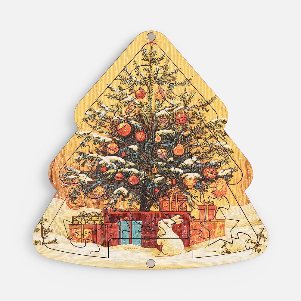 Очаровательный пазл в форме елочки — воплощение новогоднего уюта и тепла. Идеально украшенная елка в окружении подарков на фоне заснеженного пейзажа — просто сама гармония праздника. Такой стиль классической новогодней открытки подарит особое настроение и предвкушение волшебства!