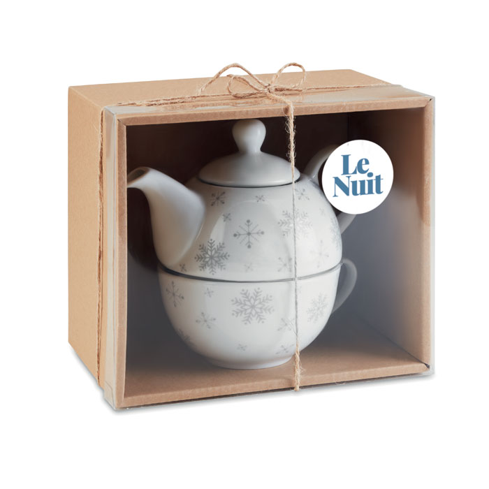 Набор чайный. Чайник 400 мл с принтом снежинки и керамической чашкой 260 мл. Представлен в подарочной коробке. При тампопечати мытье в посудомоечной машине небезопасно. -