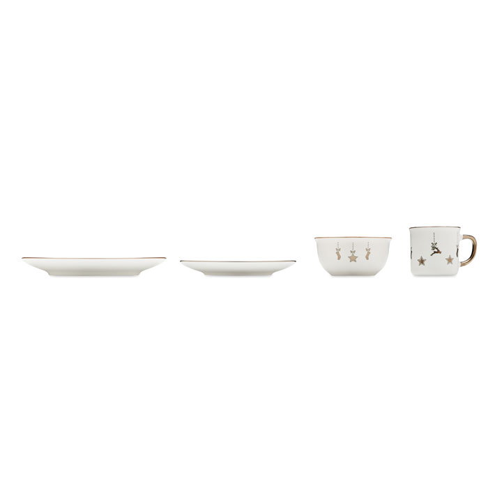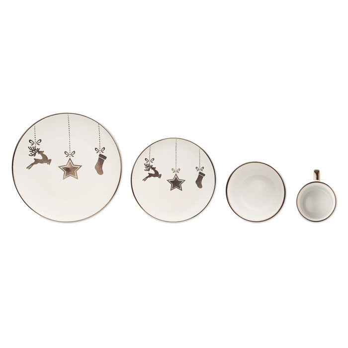 Рождественский керамический сервиз из 4 предметов. Включает: обеденную тарелку, тарелку для завтрака, миску для хлопьев/салата (500 мл) и кружку (300 мл). Поставляется в подарочной коробке. -