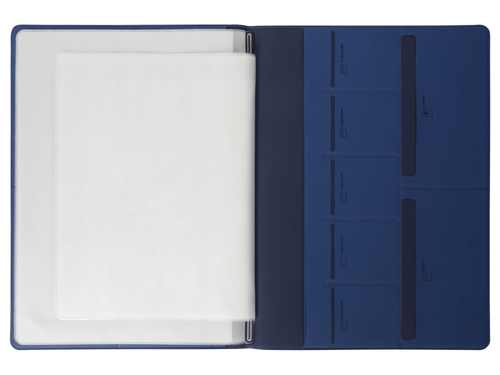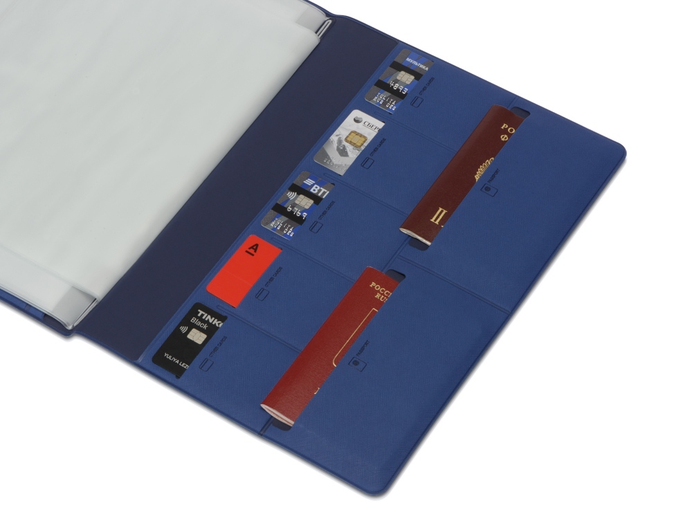 Обложка выполнена из экокожи, имеет внутренний слой из бархатистого материала и разбита на множество карманов: два больших кармана-отделения А4, 6 горизонтальных кармана с подписями и иконками, уточняющими тип документа, который можно поместить внутрь, пять карманов под визитки или кредитные карты.